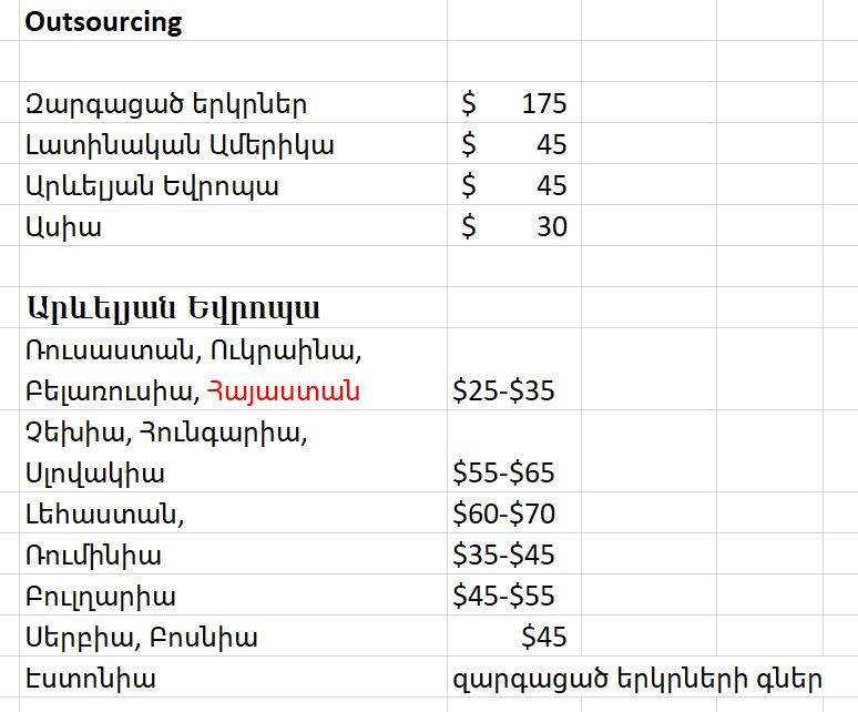 Այստեղ տեղադրել եմ ԱյԹի ոլորտի ծրագրավորողների ժամավճարները ըստ երկրների։ Ինչպես տեսնում եք, Հայաստանը Եվրոպայի նվազագույն գին ունեցողների մեջ է։ Երբ ասում են, որ կրթություն ստացած, բարձր արտադրողականությամբ մարդուն պետք է աջակցենք, պիտի հասկանանք, թե այդ արտադրողականությունն ինչքան է։ Ինչպես տեսնում ենք, մենք այնքան էլ լավ դիրքերում չենք։ Ավելին, գտնվելով Ռուսաստանի ու Բելառուսի հետ մրցակցային նույն շարքում, իսկ այդ երկրներում եկամտահարկը ցածր է, մեր գործարարները դժվարանում են մրցակցության մեջ մտնել նրանց հետ, ծրագրավորողները նեղվում են։