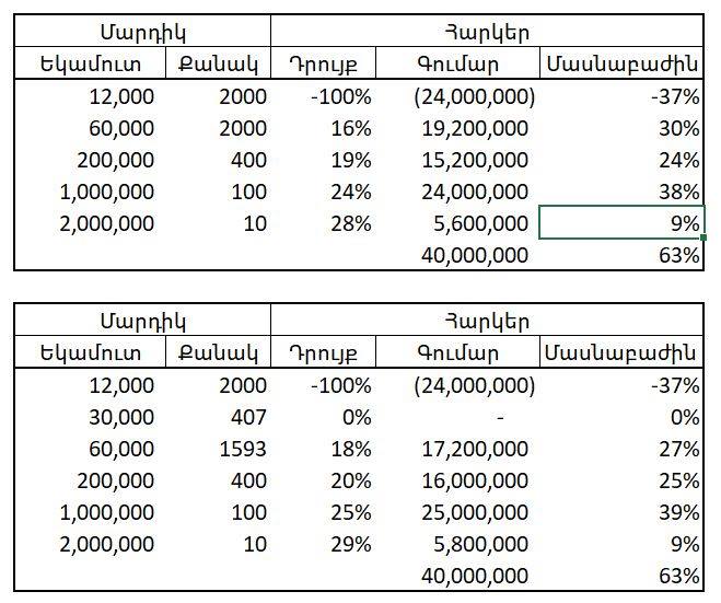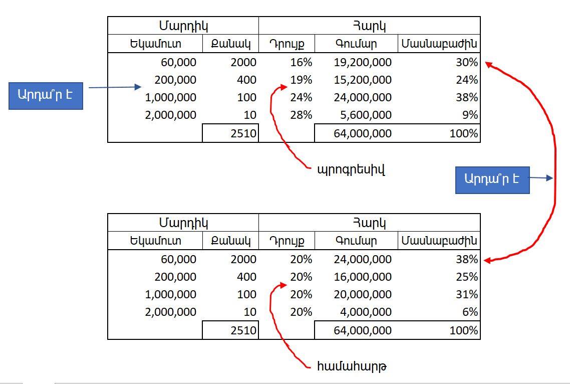 Այս պահին արձանագրենք մի փաստ – ինչպես ես հարկում, քո վերաբերմունքն է տվյալ խավին կամ դասակարգին։ Եթե քիչ վաստակողին ու շատ վաստակողին հավասար ես հարկում, ուրեմն տարբերություն չես տեսնում այդ երկու խավերի մեջ (մինչդեռ մենք սոցիալական երկիր ենք)։ Եվս մի պահ արձանագրենք։ Խավերը տարբեր են, ու կարելի է այս աղյուսակը վերադասավորել կին-տղամարդ։