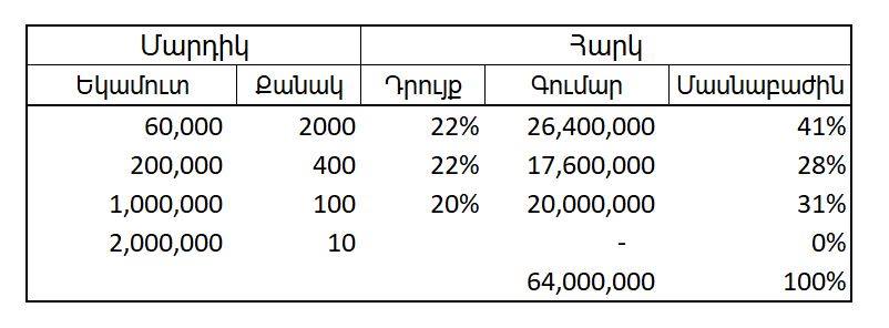 Իրոք, մեր պայմանական երկրում 10 հոգի ավելի շատ արդյունք է ստեղծում և նրանք վճարում էին ամբողջ հարկերի ընդամենը 6 տոկոսը համահարթի դեպքում։ Ինչու՞ խանգարել նրանց, միգուցե աջակցենք, չէ որ նրանք են այս երկրի համար մեծագույն արժեք ստեղծողը, ափսոս քիչ են. Խելացի, արարող ու ստեղծագործ մարդկանց եկեք աջակցենք՝ սահամանենք նրանց համար «0» տոկոս եկամտահարկ։ Այժմ նայենք աղյուսակին, «արարող» ու բարձր վաստակող խավին այստեղ որոշել ենք աջակցել։