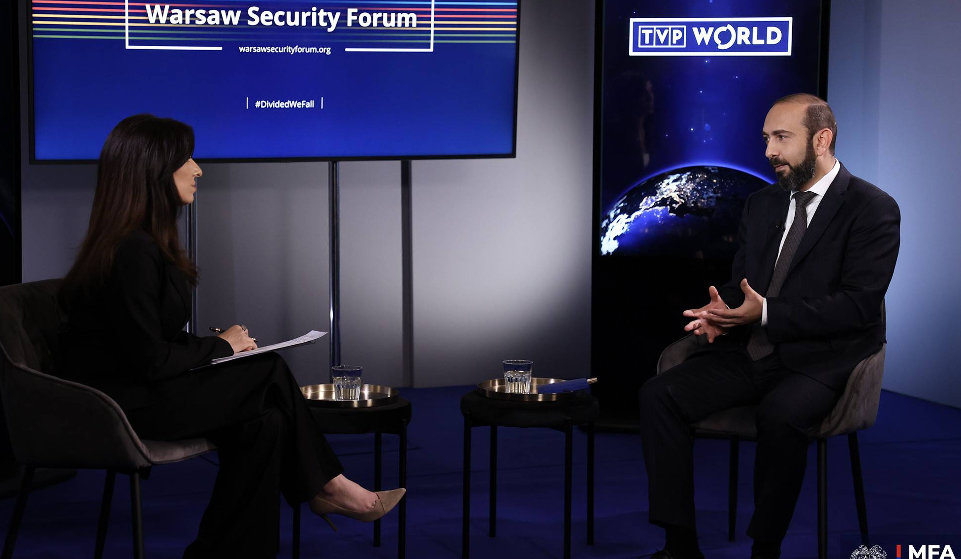«Լրագրող. Բարև ձեզ և բարի գալուստ TVP World։ Ես Դիանա Սկայան եմ, և մենք գտնվում ենք Վարշավայի անվտանգության ֆորումի շրջանակներում։ Իմ այսօրվա հյուրն է Հայաստանի արտաքին գործերի նախարար Արարատ Միրզոյանը։ Շատ շնորհակալություն, պարոն նախարար, որ այսօր մեզ հետ եք։