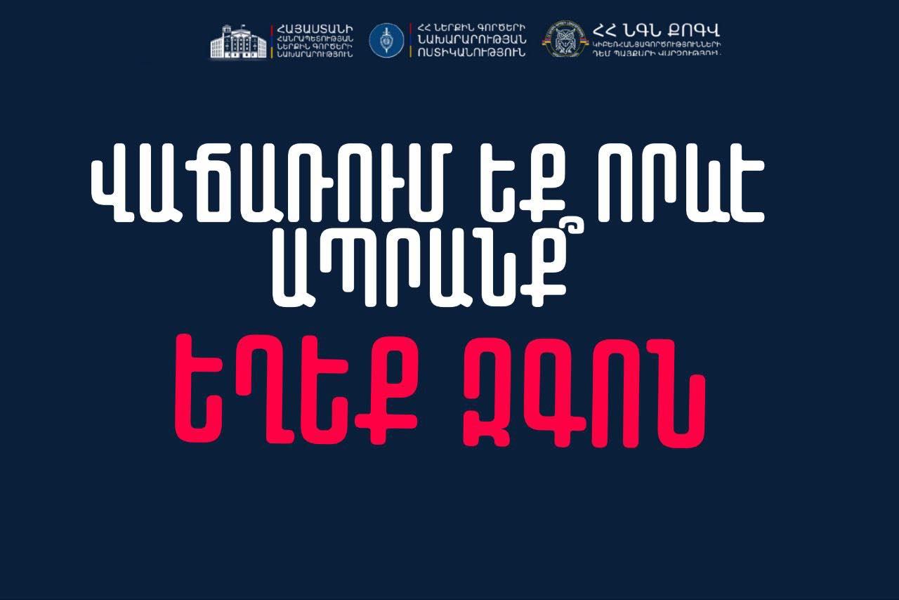 «Եթե Ձեզ հետ կապվել են հեռահաղորդակցման հավելվածի միջոցով («Whatsapp», «Viber», «Telegram» և այլն) և առաջարկում են Ձեր կողմից վաճառվող ապրանքը գնելու, գումարը իբր Ձեր բանկային քարտին փոխանցելու կամ վաճառվող ապրանքի առաքման համար էլեկտրոնային պայամանագիր կնքելու համար տրամադրել Ձեր բանկային քարտի տվյալները, այդ թվում նաև SMS հաղորդագրությամբ ստացված բանկային կոդը՝ լուսանկարների տեսքով կամ «գնորդի կողմից» ուղարկված հղումով մուտքագրելով անձնական և բանկային քարտի տվյալները ՝ ՈՉ ՄԻ ԴԵՊՔՈՒՄ ՉՎՍՏԱՀԵՔ:
