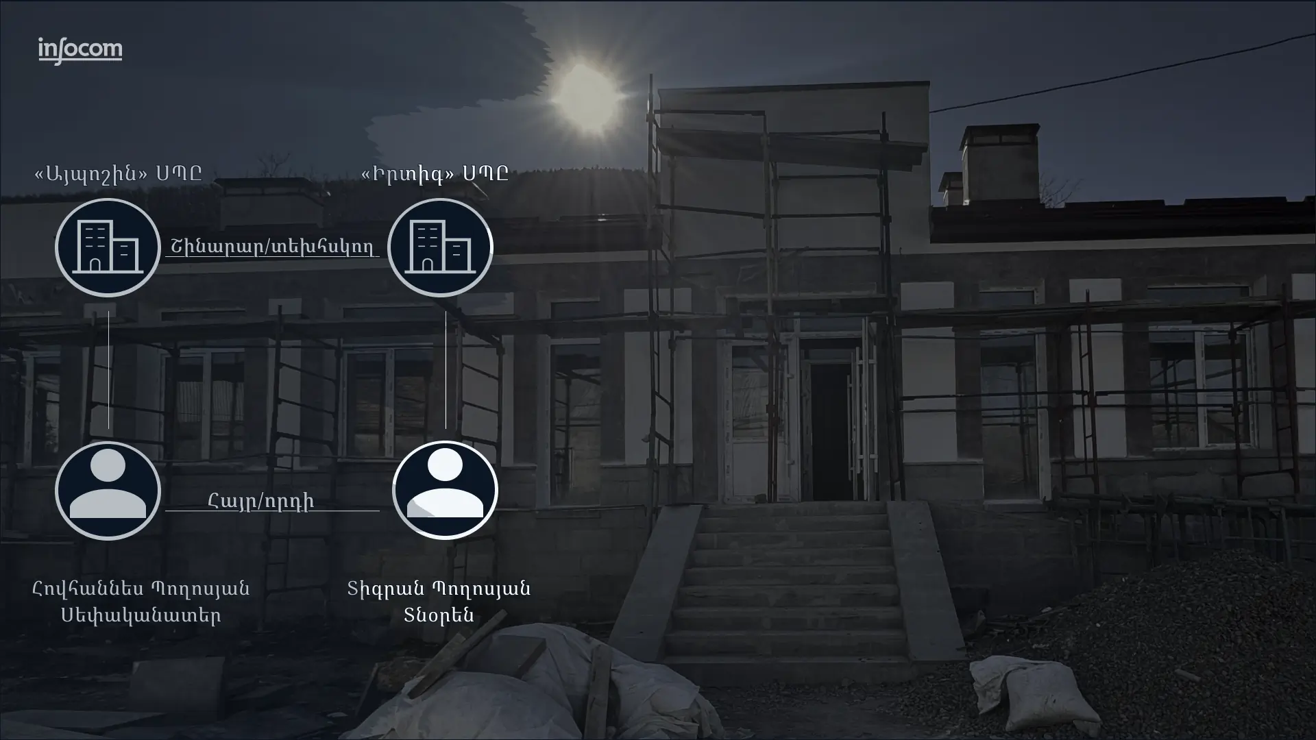 Հովհաննես և Տիգրան Պողոսյանները հայր և որդի են։ Հովհաննես Պողոսյանը «Այպոշին» շինարարական ընկերության սեփականատերն է, Տիգրան Պողոսյանը՝ «Իրտիգ» ընկերության տնօրենը։ «Իրտիգ» ընկերությունն իրականացնում է շինարարությունների որակի տեխնիկական հսկողություն։ «Ինֆոքոմը» նույնականացրել է պետական գնման ընթացակարգերով պատվիրված շինարարության 10 դեպք, երբ «Այպոշին» ընկերության աշխատանքի տեխնիկական հսկողությունն իրականացրել է «Իրտիգը»։