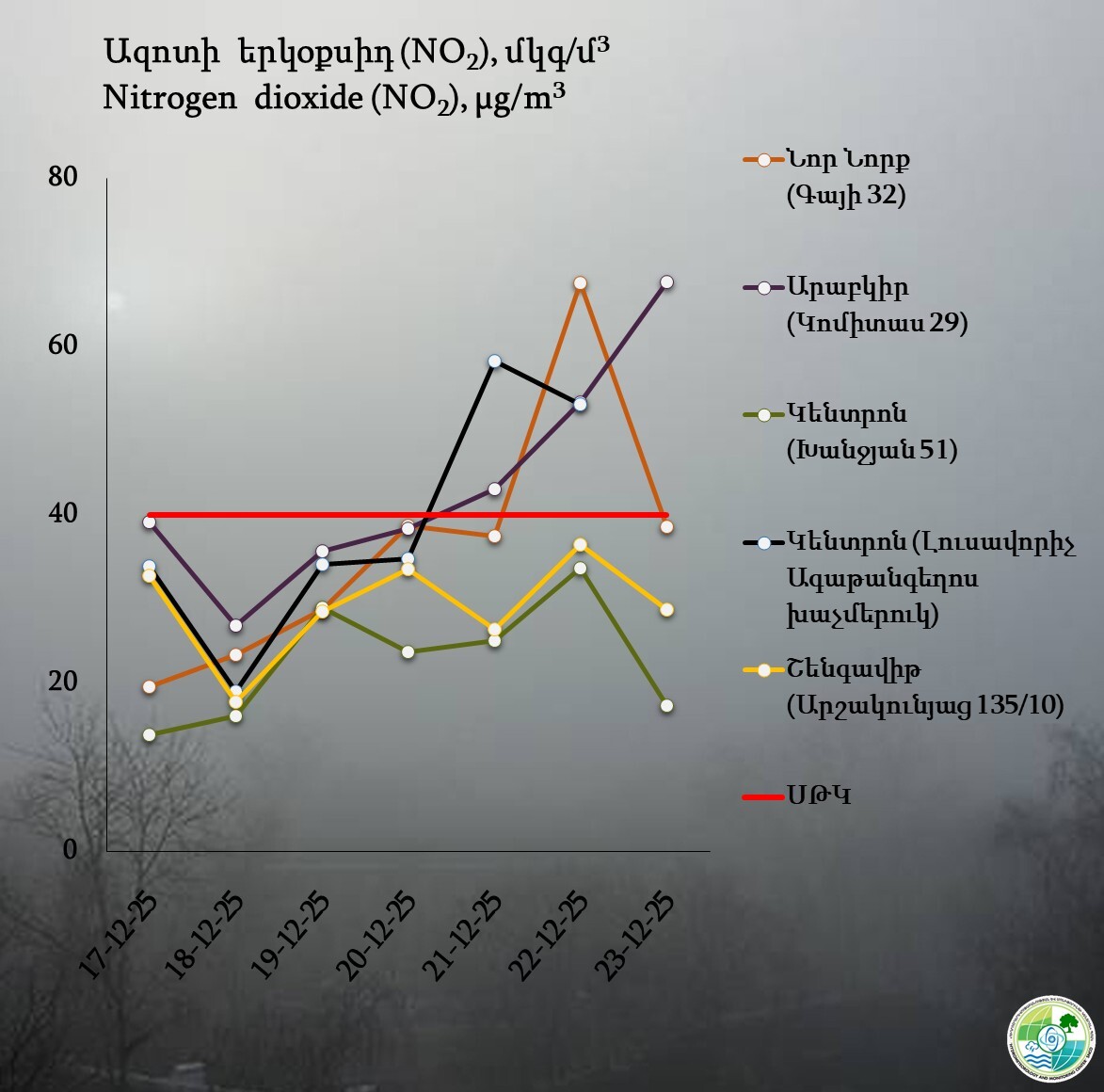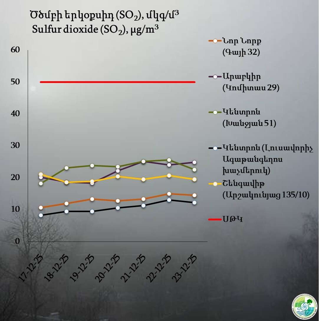 Ազոտի երկօքսիդի պարունակությունը գերազանցել է սահմանային թույլատրելի կոնցենտրացիան Կենտրոն վարչական շրջանում դեկտեմբերի 21-ին և 22-ին, Արաբկիրում՝ դեկտեմբերի 21-23-ին, Նոր Նորքում՝ դեկտեմբերի 22-ին, Շենգավիթում՝ չի գերազանցել։