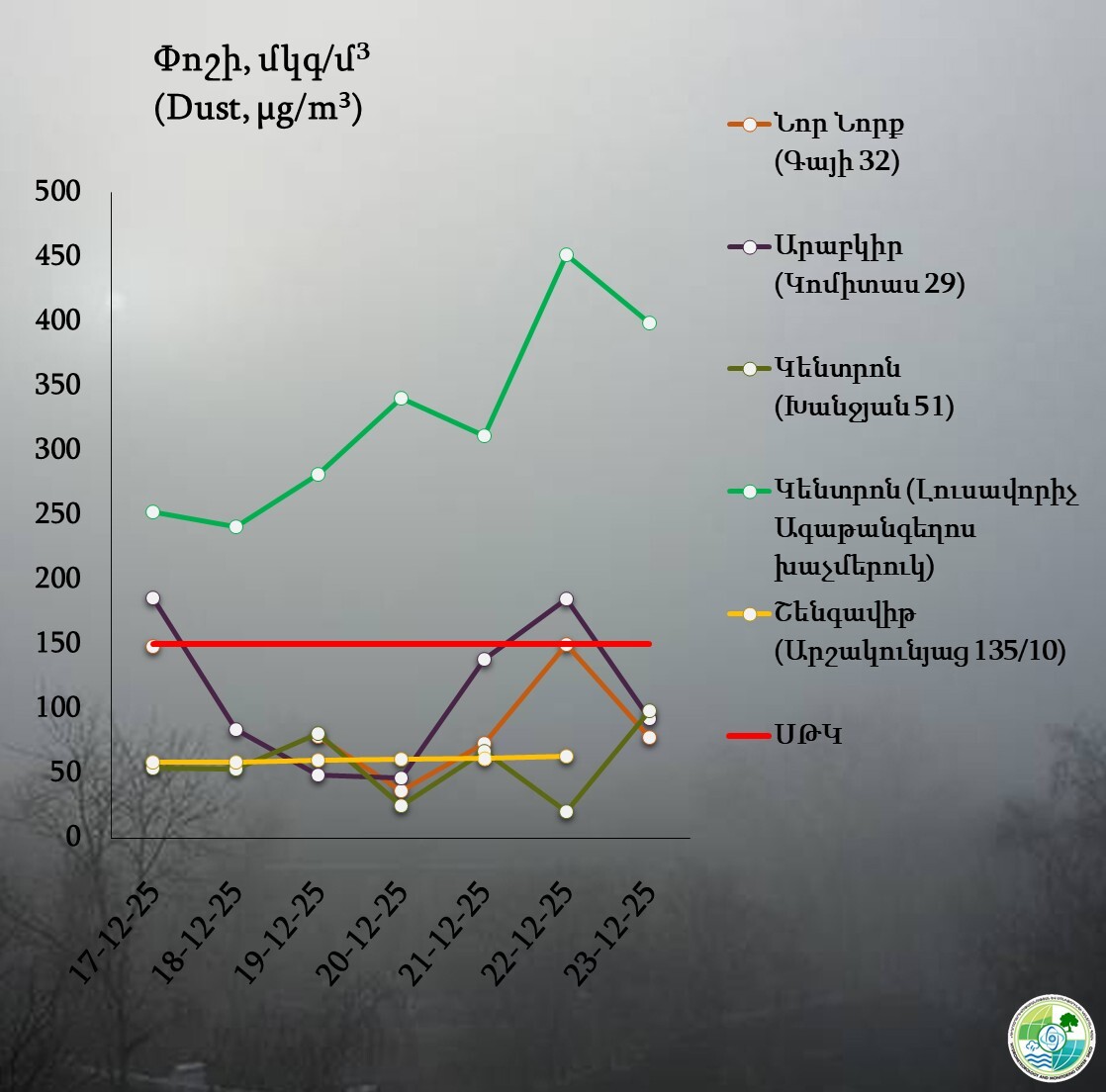 Նշվում է, որ դեկտեմբերի 17-23-ը փոշու պարունակությունը գերազանցել է սահմանային թույլատրելի կոնցենտրացիան Կենտրոն վարչական շրջանում։