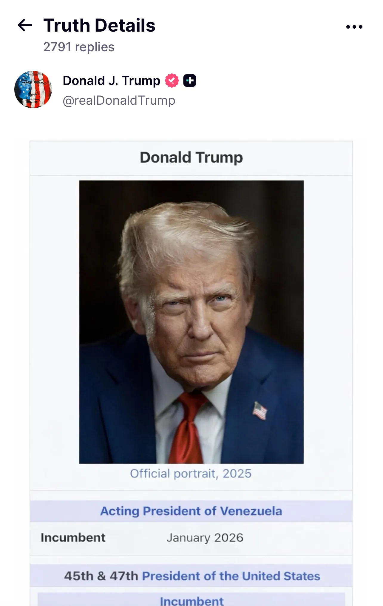 Economictimes-ը գրել է, «ԱՄՆ նախագահ Դոնալդ Թրամփը իր սոցիալական ցանցի էջում լուսանկար է հրապարակել՝ պնդելով, որ ինքը «Վենեսուելայի նախագահի պաշտոնակատարն է» է: Truth Social-ում հրապարակված գրառումը ցույց էր տալիս թվային փոփոխված լուսանկար, որը Թրամփին ներկայացնում էր այդ պաշտոնում՝ Վենեսուելայում վերջին զարգացումներից հետո»:
