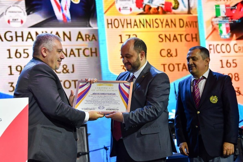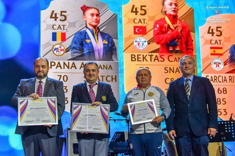Նշենք նաև, որ ծանրամարտի Եվրոպայի առաջնության փակման ժամանակ ծանրամարտի Եվրոպայի ֆեդերացիայի նախագահ Անտոնիո Կոնֆլիտին պատվոգրեր է շնորհել ՀՀ վարչապետի աշխատակազմի ղեկավար Արայիկ Հարությունյանին, ՀՀ ԿԳՄՍ նախարարի տեղակալ Կարեն Գիլոյանին և Հայաստանի ծանրամարտի ֆեդերացիայի գլխավոր քարտուղար Փաշիկ Ալավերդյանին՝ մրցաշարը լավագույնս կազմակերպելու համար։