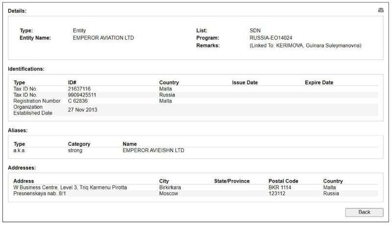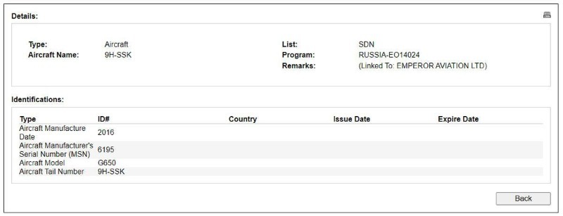 Ամերիկյան կողմի հակառուսական պատժամիջոցների տակ են հայտնվել թե՛ «Emperor Aviation»-ը, թե՛ դրա ավիապարկում գտնվող 8 շքեղ ինքնաթիռները, որոնք բոլորը գրանցված են Մալթայում՝ 4 հատ «Bombardier Global Express», 2 հատ «Gulfstream G650» եւ 1-ական «Cessna Citation XLS+» ու «Bombardier Challenger 650»: