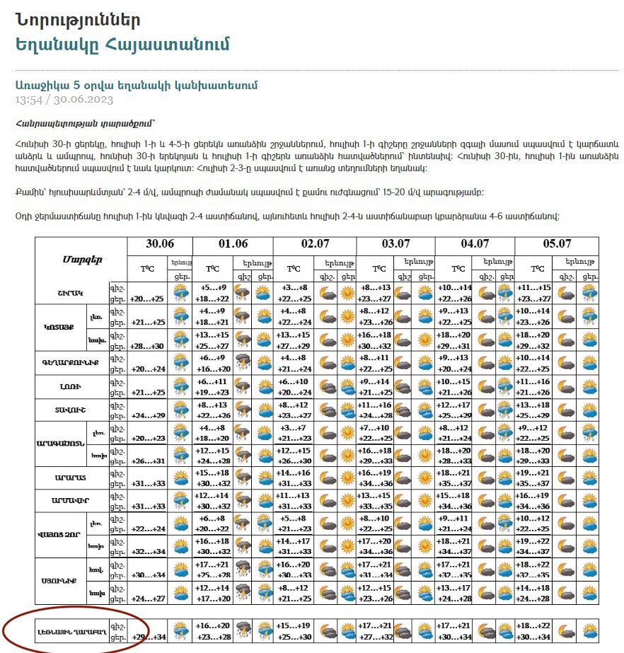 factor.am: Շրջակա միջավայրի նախարարության «Հիդրոօդերևութաբանության և մոնիթորինգի կենտրոն» ՊՈԱԿ-ն ամեն օր կայքում հրապարակում է առաջիկա օրերին Հանրապետության տարածքում սպասվող եղանակի կանխատեսումը։ Եղանակի կանխատեսման մասին տեղեկությունները տեղադրվում էին նաև Արտակարգ իրավիճակների նախարարության կայքում։ Նախկինում ՀՀ մարզերում սպասվող եղանակը ներկայացնելուց հետո՝ վերջում մարզերին կից ներկայացվում էր նաև Արցախում սպասվող եղանակը։