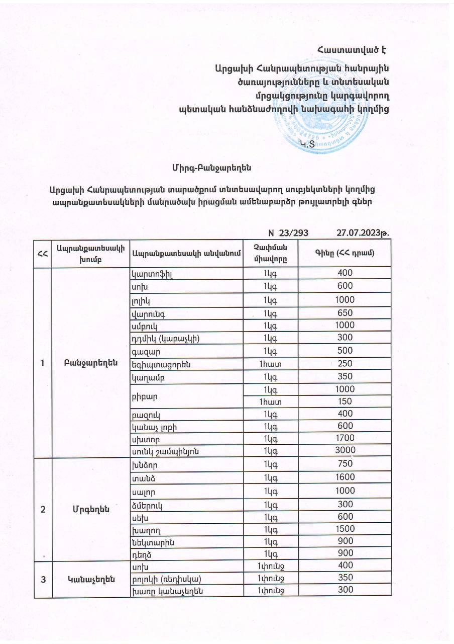 Արցախում վերանայվել են միրգ-բանջարեղենի շրջանառության ոլորտում մանրածախ իրացման ամենաբարձր թույլատրելի գները՝ 27.07.2023թ. դրությամբ: Այս մասին հայտնում են Արցախի հանրային ծառայությունները և տնտեսական մրցակցությունը կարգավորող պետական հանձնաժողովից՝ կից ներկայացնելով սուբյեկտների կողմից ապրանքատեսակների մանրածախ իրացման ամենաբարձր թույլատրելի գները։