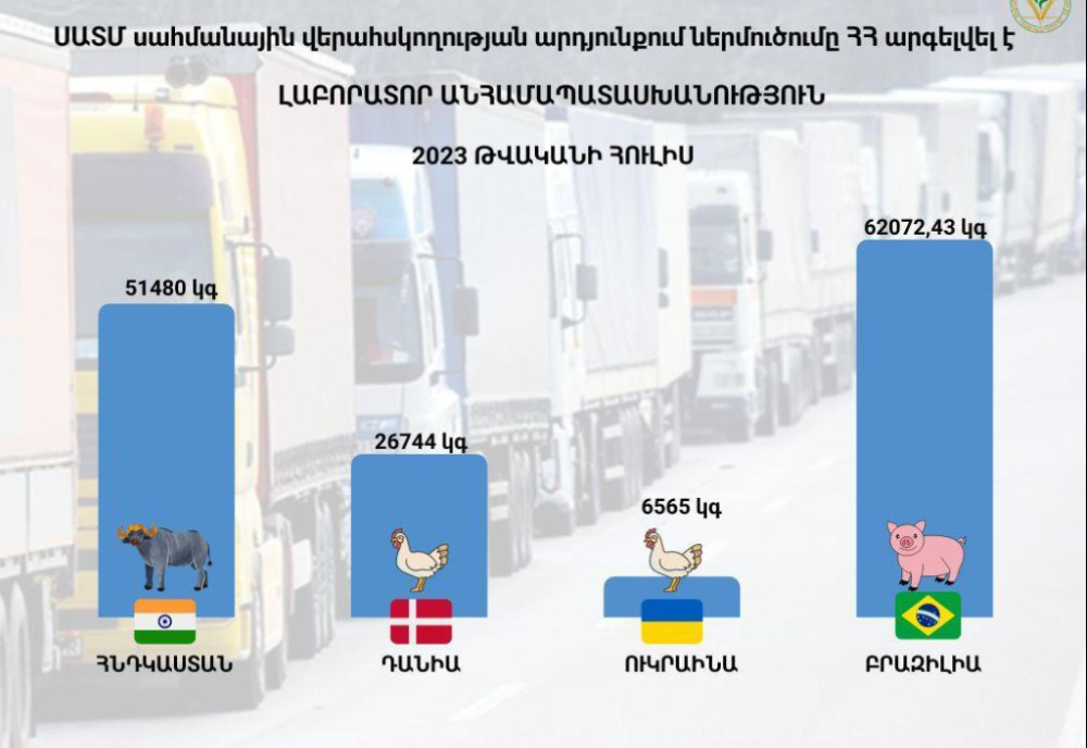 - Գոմեշի միս՝ 26000 կգ, ՄԱՖԱնՄՔ և ախտածին մանրէներ, այդ թվում սալմոնելաներ ցուցանիշով վերադարձվել է: