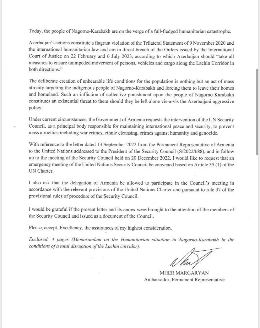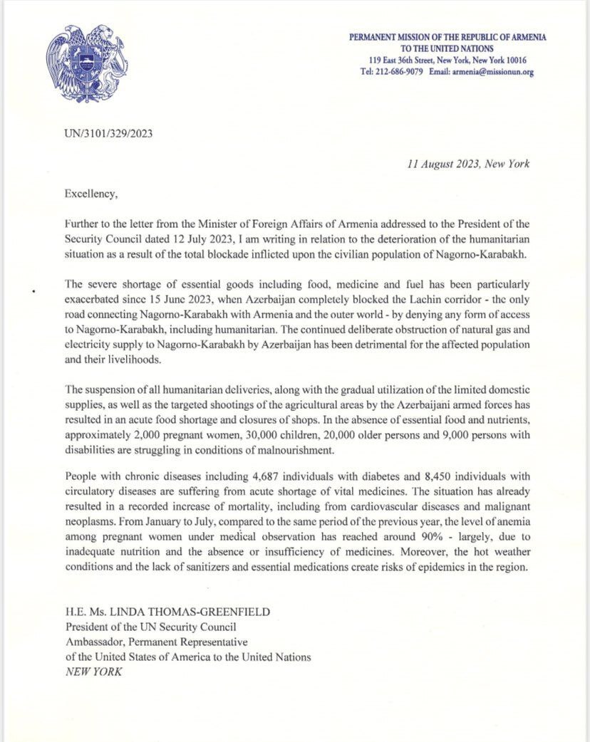 Հայաստանը դիմել է ՄԱԿ-ի Անվտանգության խորհրդին՝ խնդրելով, որ ԱԽ արտակարգ նիստ գումարվի՝ կապված Ադրբեջանի կողմից Լաչինի միջանցքի շրջափակման և դրա հետևանքով հումանիտար իրավիճակի վատթարացման հետ։