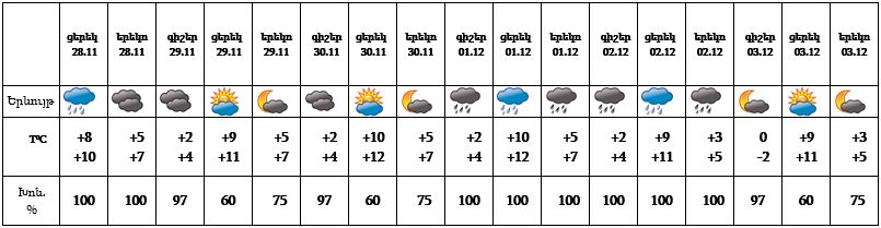 Երևան քաղաքում՝ նոյեմբերի 28-ի ցերեկը, դեկտեմբերի 1-2-ը սպասվում է անձրև, 29-30-ը, դեկտեմբերի 3-ին սպասվում է առանց տեղումների եղանակ։