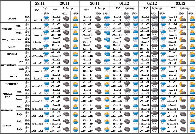 Հանրապետության տարածքում՝ նոյեմբերի 28-ի ցերեկը, 30-ին առանձին շրջաններում, դեկտեմբերի 1-2-ը շրջանների մեծ մասում սպասվում են տեղումներ, լեռնային շրջաններում՝ ձյան տեսքով, նոյեմբերի 29-ին, դեկտեմբերի 3-ին սպասվում է առանց տեղումների եղանակ։