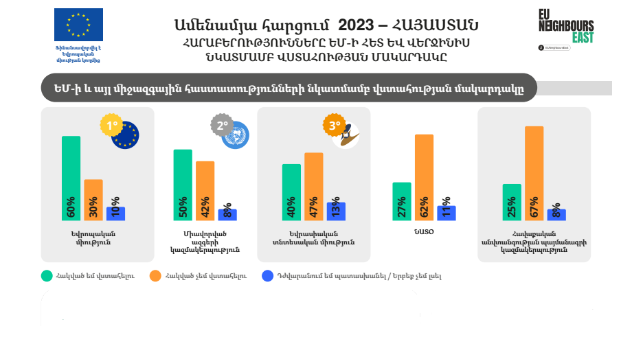 Միջազգային կառույցների շրջանում Հայաստանի քաղաքացիները ամենաշատը՝ 60 տոկոսով, հակված են վստահելու Եվրոպական միությանը, ամենաքիչը՝ 25 տոկոսով՝ Հավաքական անվտանգության պայմանագրի կազմակերպությանը։ 2023 թ․ Հայաստանում հասարակական կարծիքի ամենամյա հարցման տվյալներ են, որն իրականացվել է Եվրոպական միության՝ «EU NEIGHBOURS east» ծրագրի շրջանակում 1000 քաղաքացիների հետ դեմ առ դեմ հարցազրույցների միջոցով։