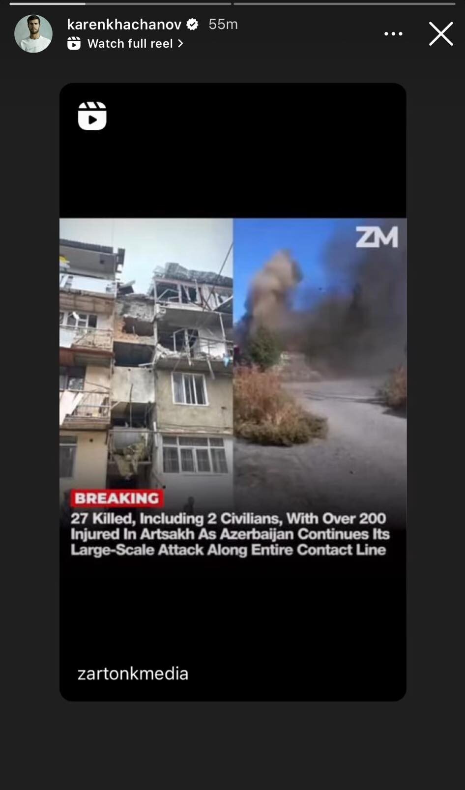 Հայազգի թենիսիստ Կարեն Խաչանովը Instagram-ի Storys բաժնում կիսվել է Արցախում Ադրբեջանի կողմից իրականացվող ռազմական գործողությունների վերաբերյալ տեղեկություններով: