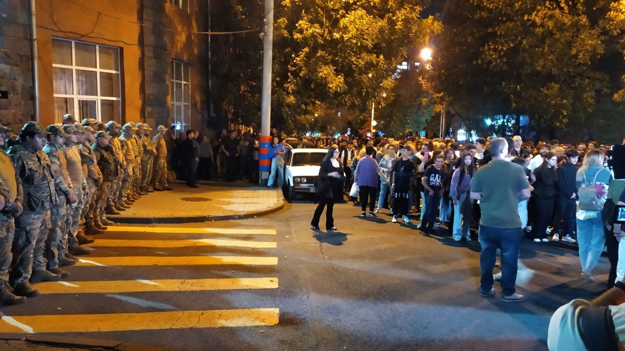 Ոստիկանություն հասնելուց հետ քաղաքացիները սկսեցին գոչել՝ «Նիկոլ՝ թշնամի», «Նիկոլ՝ դավաճան»։ Ոստիկանության բոլոր մուտքերի առաջ ոստիկանության ծառայողներ են, քաղաքացիները կանգնում էին մուտքերի մոտ ու բղավում՝ «Ամոթ»։