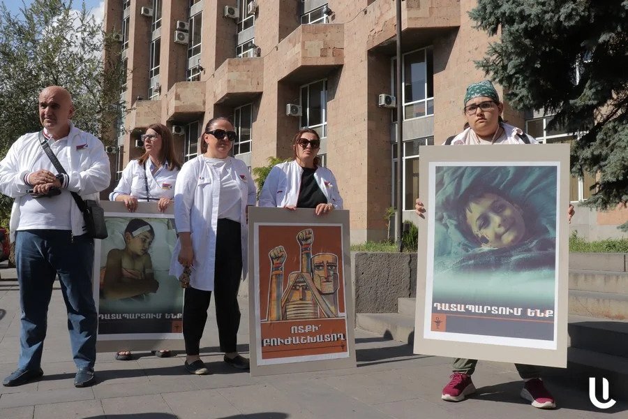 aravot.am: Մի խումբ բուժաշխատողներ այսօր բողոքի ցույց էին անում առողջապահության նախարարության շենքի մոտ։ Նրանք նախարարությունից պահանջում են համակարգված աշխատել Արցախից բռնի տեղահանվածների հետ։