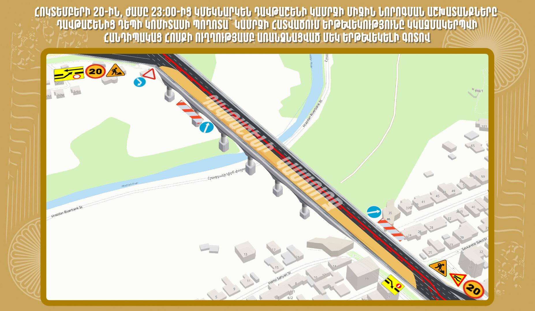 Երևանի քաղաքապետարանից տեղեկացնում են, որ հոկտեմբերի 20-ին` ժամը 23:00-ից, իրականացվելու են Դավթաշենի կամրջի միջին նորոգման աշխատանքներ, ինչով պայմանավորված՝ Դավթաշեն վարչական շրջանից դեպի Կոմիտասի պողոտա՝ կամրջի հատվածում երթևեկությունը կազմակերպվելու է հանդիպակաց հոսքի ուղղությամբ առանձնացված մեկ երթևեկելի գոտով: