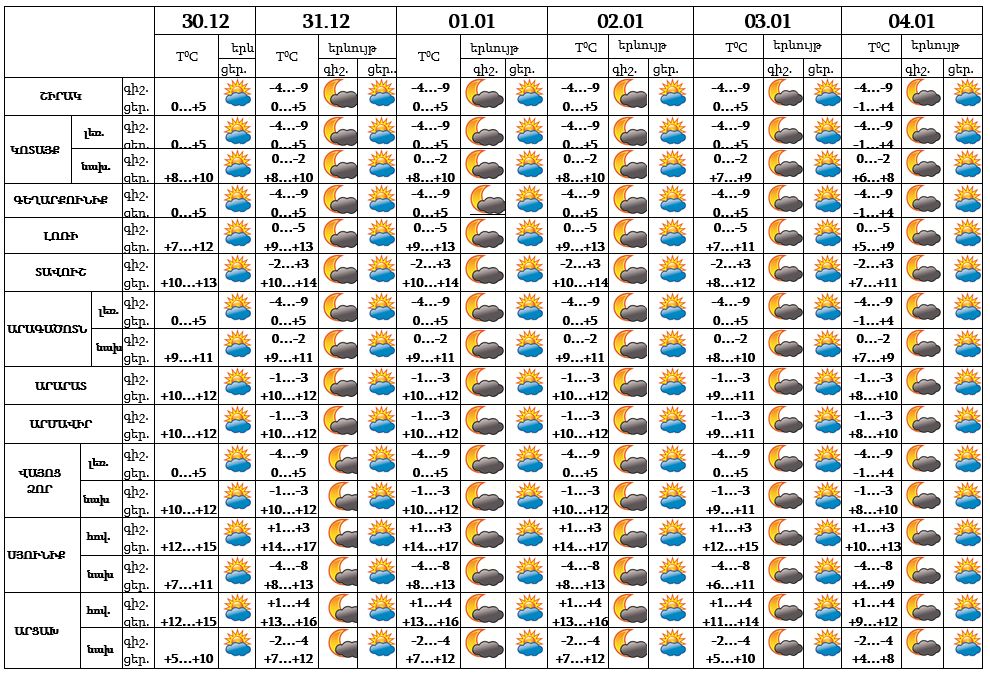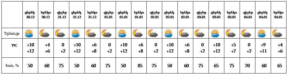 Դեկտեմբերի 30-ի ցերեկը, 31-ին, հունվարի 1-4-ը սպասվում է առանց տեղումների եղանակ: