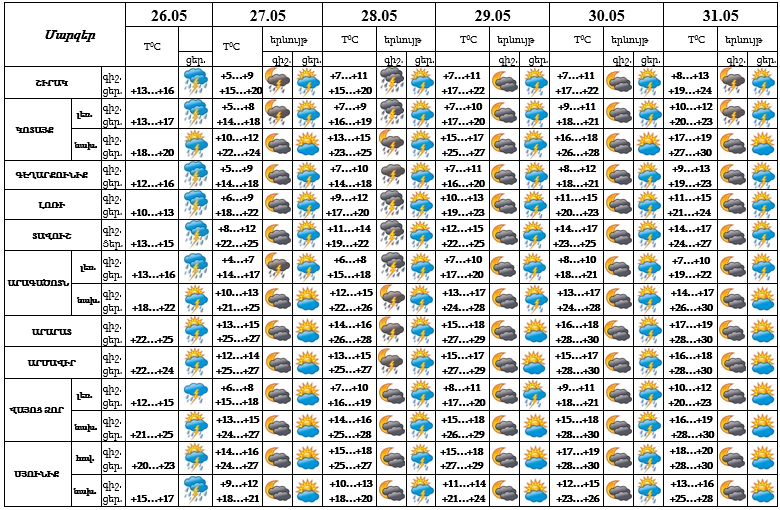Մայիսի 26-ի ցերեկը հանրապետությունում ժամանակ առ ժամանակ սպասվում է անձրև և ամպրոպ, առանձին հատվածներում՝ ինտենսիվ, հնարավոր է նաև կարկուտ։ Մայիսի 27-31-ին առանձին շրջաններում սպասվում է կարճատև անձրև և ամպրոպ։ Քամին՝ հարավարևմտյան՝ 3-5մ/վ, ամպրոպի ժամանակ սպասվում է քամու ուժգնացում 18-23մ/վ արագությամբ: Օդի ջերմաստիճանը մայիսի 27-30-ին աստիճանաբար կբարձրանա 4-6, Լոռիում, Տավուշում, Սյունիքում 8-10 աստիճանով։