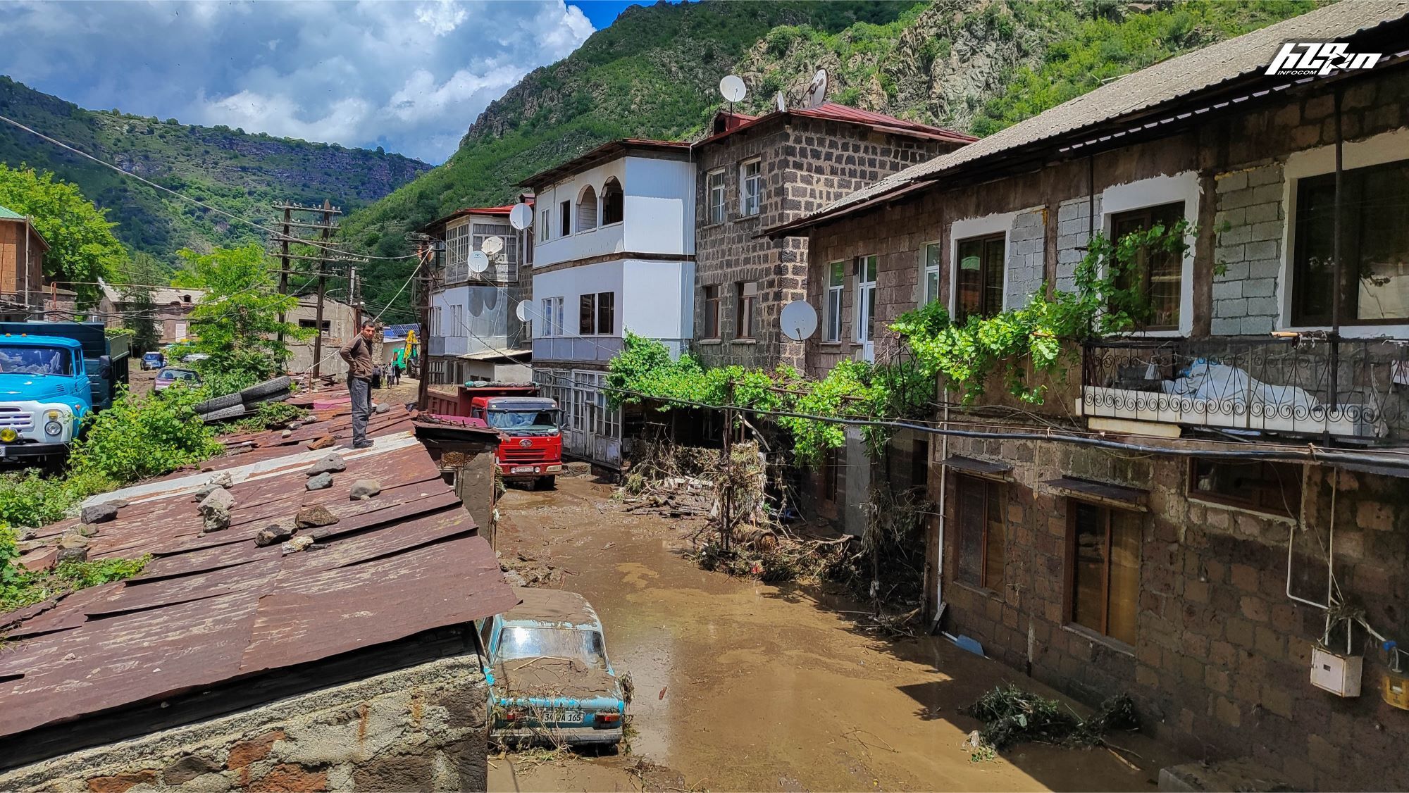 Սանահին կայարան թաղամասի բնակիչ Գառնիկ Թաթոյանը դիմացի տան տանիքից նայում է շենքի առաջին հարկի իր բնակարանին․ «Տուն գոյություն չունի,- ասում է նա,- բարեկամների, ծնողների մոտ ենք մնում հիմա»։ Համաքաղաքացի երիտասարդները բակի ցեխերի մեջ բնակիչների իրերն են փնտրում։ Մի տղա գտնում է Գառնիկի փաստաթղթերը՝ ցեխի մեջ կորած, ձեռքը երկարացնում, տալիս տիրոջը․ «Էս ա, ինչ մնացել ա»,- թղթերն աջ ու ձախ տանելով՝ ասում է Գառնիկը։ Մեկ ուրիշ երիտասարդ էլ փորձում է նրա մեքենայի մեջ մնացած առարկաները հանել, նույնիսկ կատակում են, թե՝ էս ինչքան ակնոց ունես, Գառնիկ ձյա։