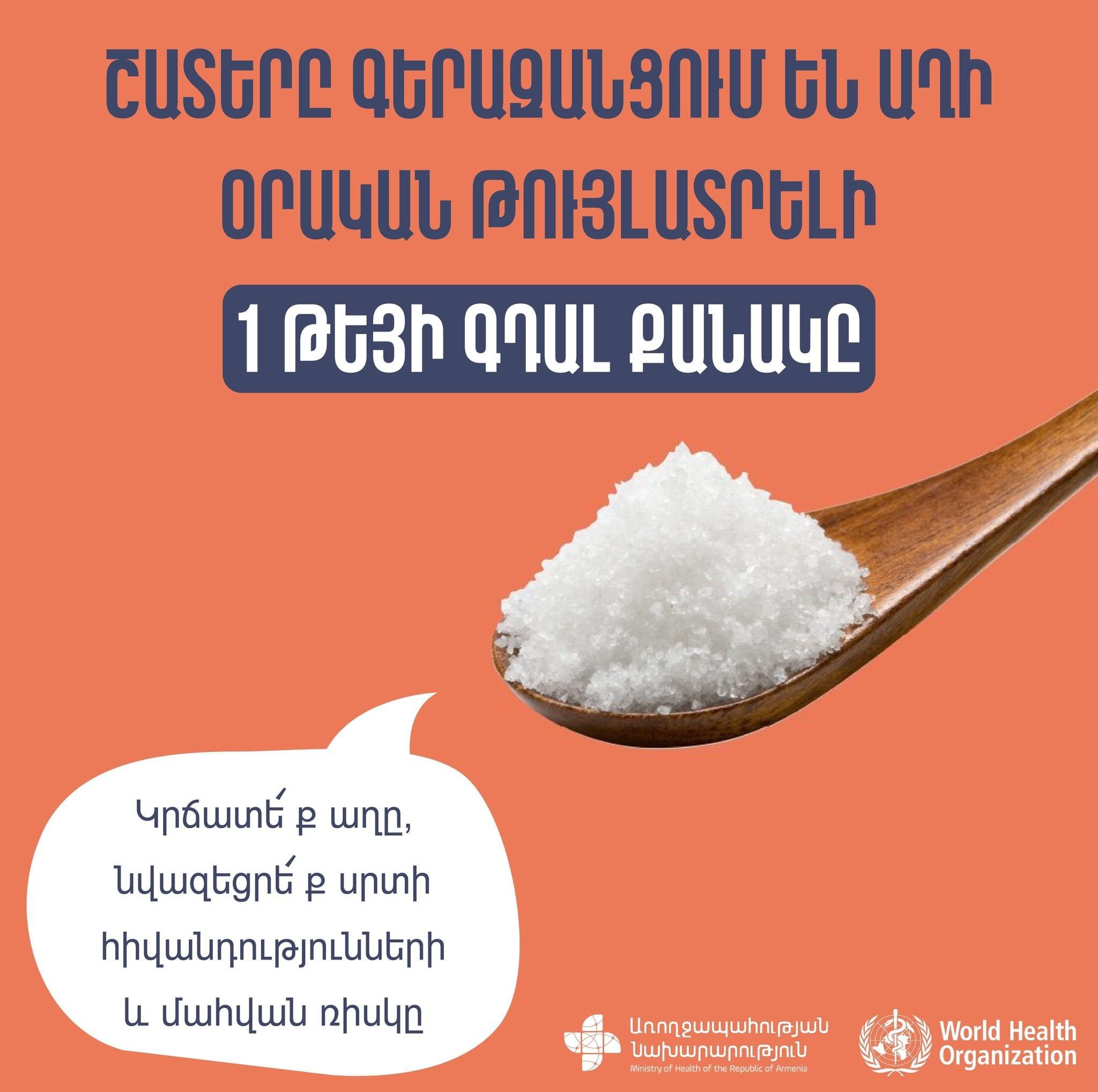 Հայաստանում 16-69 տարեկան բնակչությունը աղի օրական սպառման թույլատրելի նորման գերազանցում է ավելի քան 2 անգամ: Այս մասին հայտնում են ՀՀ առողջապահության նախարարությունից՝ հավելելով
