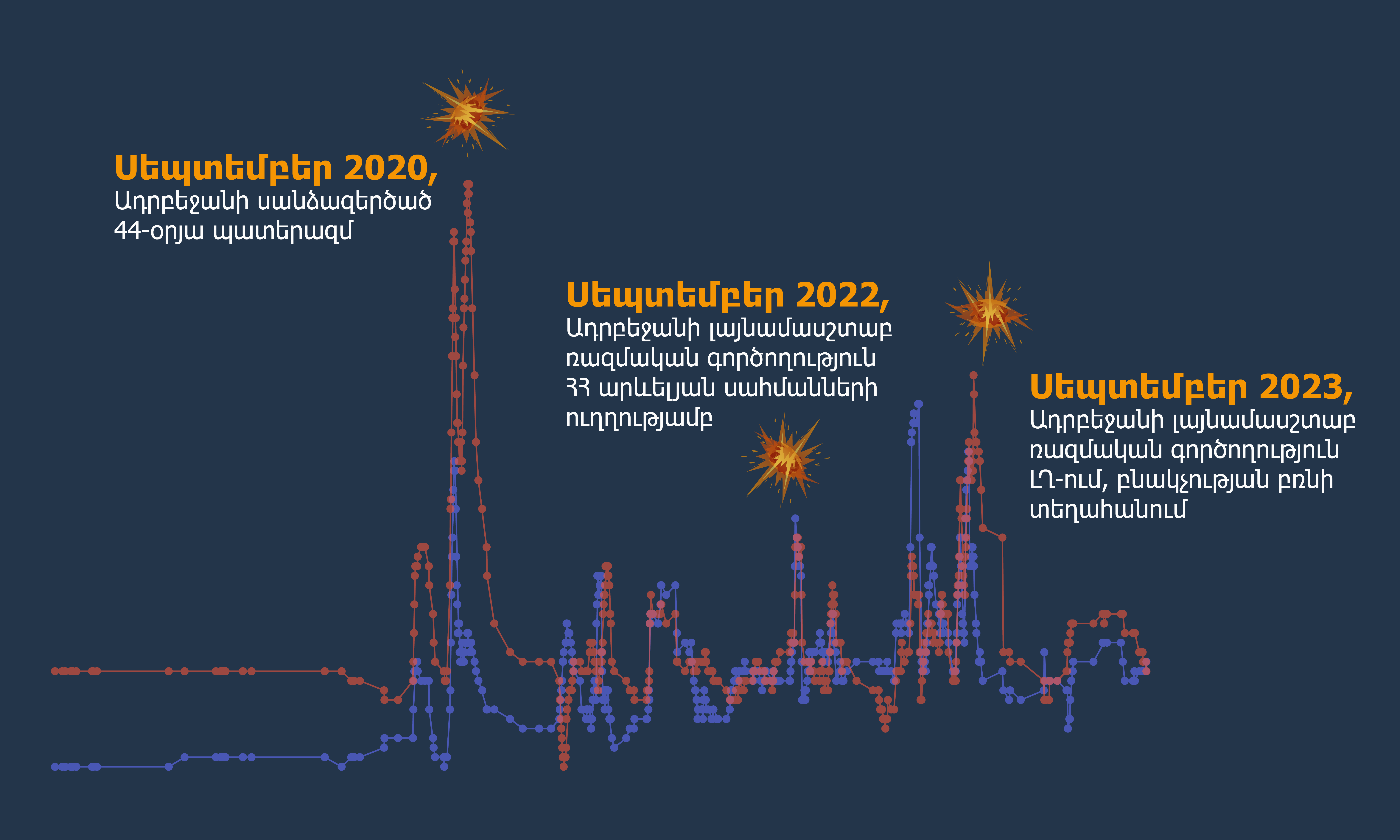 Այս գծապատկերը ներառում է Հայաստանի և Ադրբեջանի միջև տեղի ունեցած զինված հակամարտությունների, սահմանային սրացումների և սադրանքների մասին բոլոր պաշտոնական հայտարարությունները (տվյալների հավաքագրման և վերլուծության մեթոդաբանության մասին կարդացեք ստորև՝ «Ինչպես ենք հաշվարկել» բաժնում): Հորիզոնական կետագիծը ներկայացնում է Ադրբեջանի ՊՆ կողմից 2018 թվականից մինչ օրս հրապարակված հաղորդագրությունների միջին թիվը, որը կիրառվում է նաև որպես սկզբնակետ, քանի որ վերջին տարիներին ադրբեջանական կողմն է նախաձեռնել մի քանի խոշոր ռազմական բախումներ։