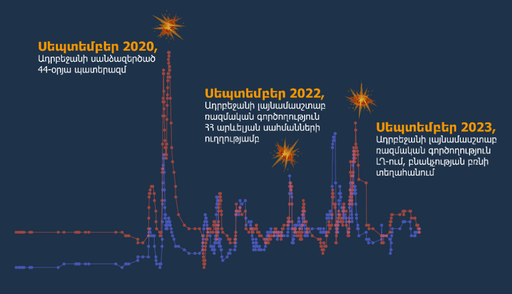 Այնուհետև զտել ենք միայն այն լուրերը, որոնք ուղիղ նշում են Ադրբեջանը՝ որպես հակառակորդ կամ Արցախի պաշտպանության բանակը՝ որպես Հայաստանի դաշնակից, իսկ Հայաստանի և Արցախի պաշտպանության ուժերը՝ որպես Ադրբեջանի հակառակորդ։ Ընտրված հաղորդագրություններն այնուհետև բաշխել ենք՝ ըստ հրապարակման օրվա, որը թույլ է տվել հստակ պատկեր ստանալ ժամանակի մեջ միտումների մասին։