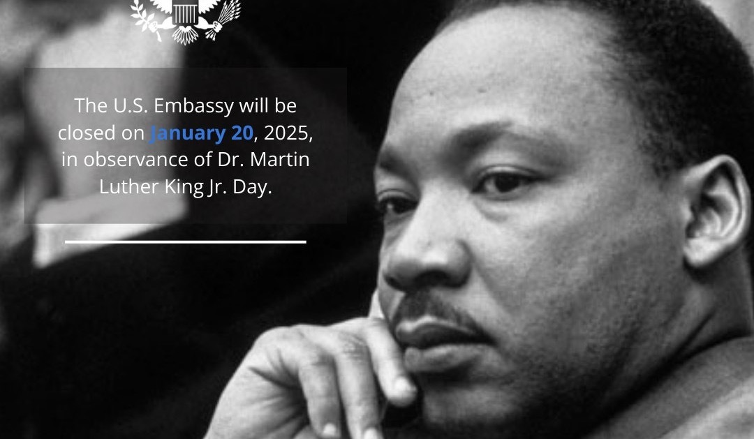 Հայաստանում ԱՄՆ դեսպանությունից հայտնում են, որ հունվարի 20-ին դեսպանատունը դ-ր Մարտին Լյութեր Քինգի օրվա կապակցությամբ փակ կլինի։