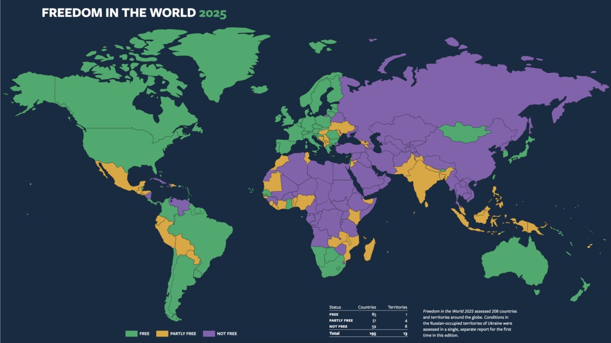 amerikayidzayn.com: Freedom House միջազգային հեղինակավոր կազմակերպությունն հրապարակել է «Ազատությունն աշխարհում – 2025» զեկույցը՝ «Դժվարին պայքար իրավունքների համար» վերտառությամբ: Այն գնահատում է աշխարհում քաղաքական իրավունքների և քաղաքացիական ազատությունների վիճակը: