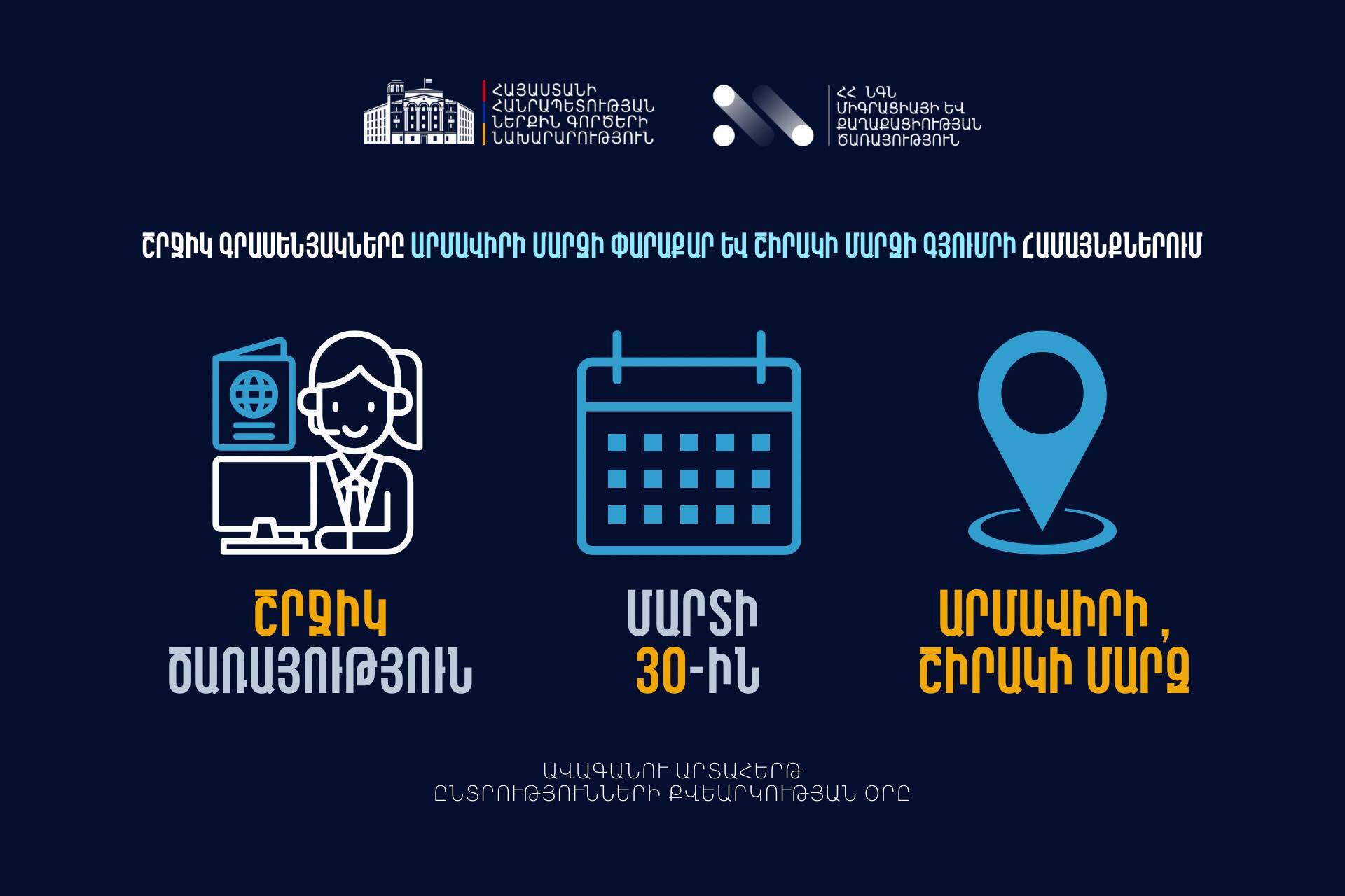 Մարտի 30-ին, ժամը 08։00-20։00-ն աշխատելու են նաև ՆԳՆ Միգրացիայի և քաղաքացիության ծառայության՝ Գյումրի 1 (հասցե՝ Շիրակացի 17), Գյումրի 2 (հասցե՝ Ղորղարյան 91/1), Գյումրի 3 (հասցե՝ Կայարանամերձ հրապարակ) և Վաղարշապատի (հասցե՝ Կամոյի փողոց, 15 շենք) ստորաբաժանումները։