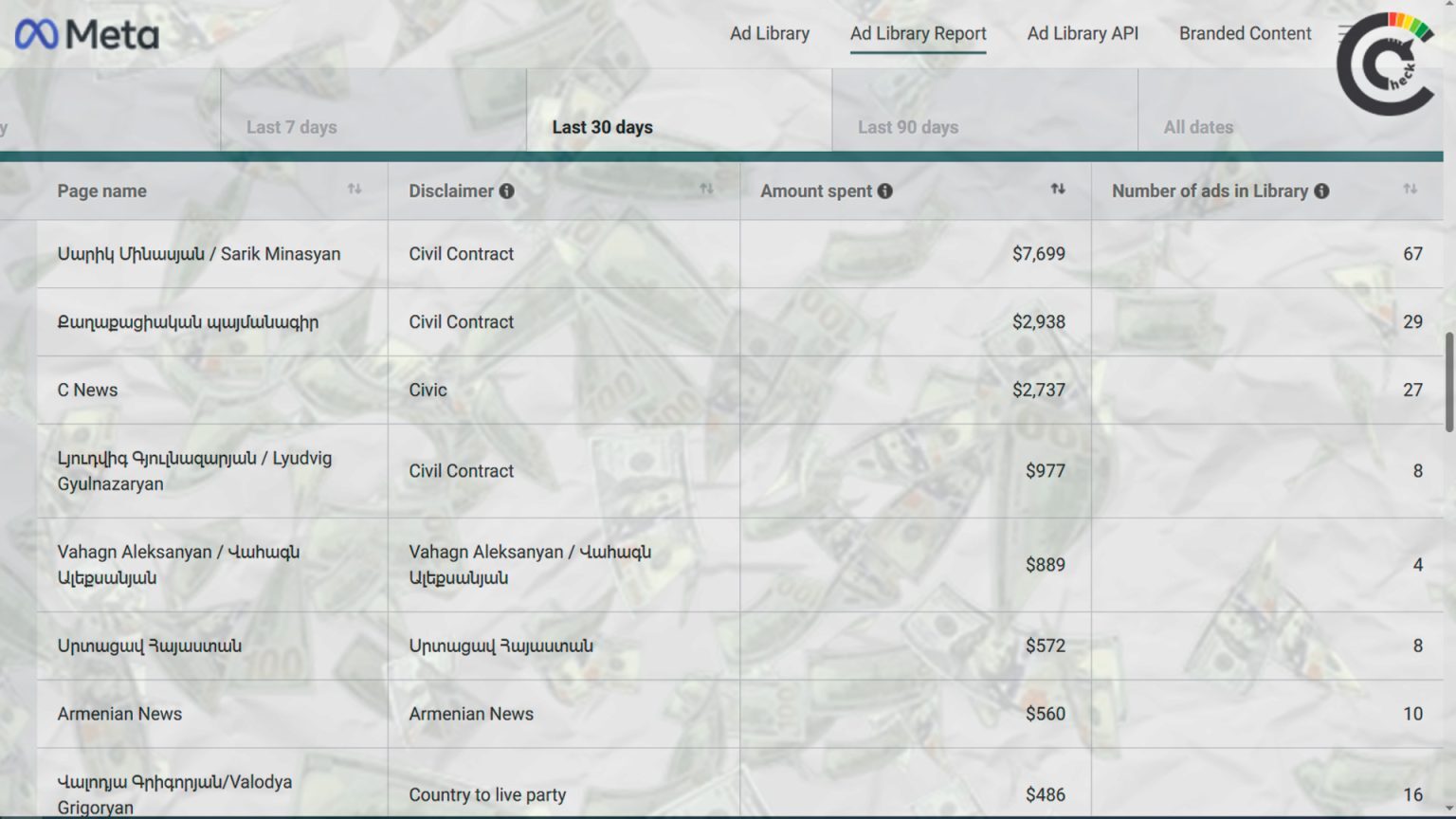 CivilNetCheck-ի ուսումնասիրությունը բացահայտել է, որ վերջին մեկ ամսում՝ փետրվարի 24-ից մարտի 25-ը, հայաստանյան տիրույթում սոցիալական, ընտրությունների կամ քաղաքական հարցերի վերաբերյալ գովազդներին ուղղվել է շուրջ 37,000 դոլար։ Այս գումարի գրեթե կեսը՝ 18,500 դոլարը, անմիջականորեն կապված է Գյումրիի և Փարաքարի ընտրությունների հետ։