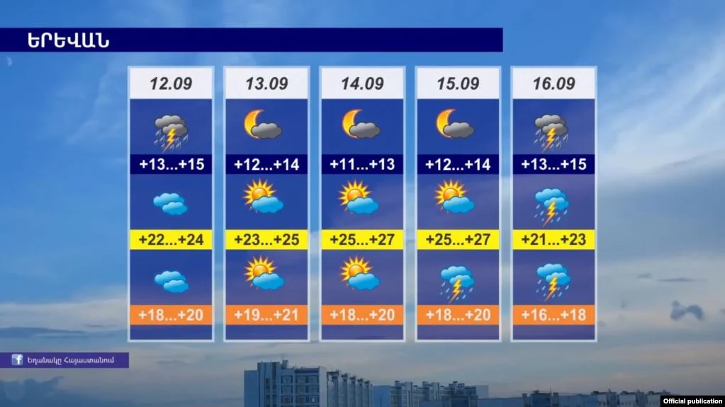 Երևանում այսօր և սեպտեմբերի 15-ի ուշ երեկոյան ժամերին, սեպտեմբերի 16-ին սպասվում է անձրև և ամպրոպ, ամպրոպի ժամանակ հնարավոր է քամու ուժգնացում։ Սեպտեմբերի 13-14-ը, 15-ի գիշերը սպասվում է առանց տեղումների եղանակ: