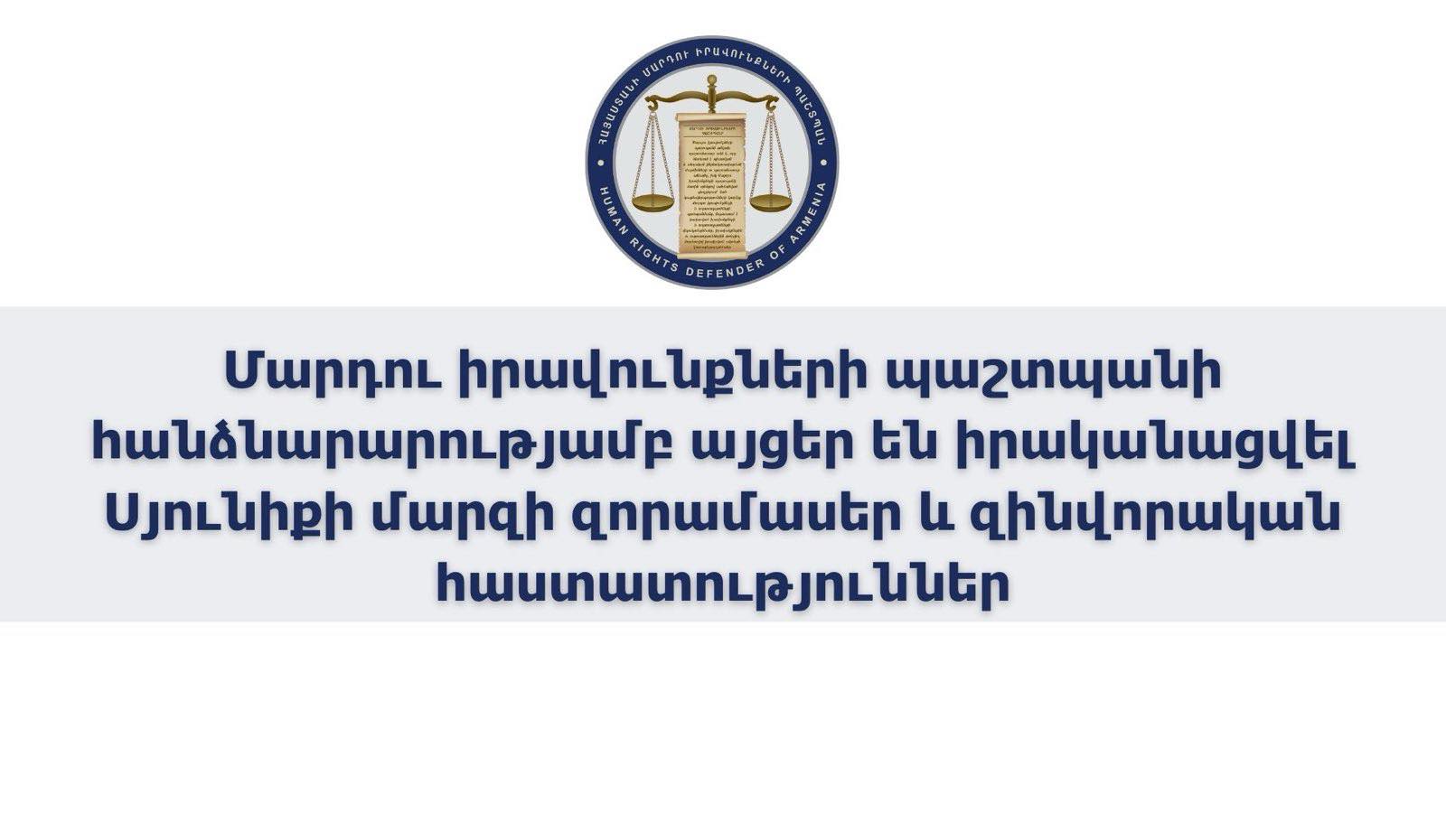 ՄԻՊ ներկայացուցիչները Մարդու իրավունքների պաշտպանի հանձնարարությամբ օգոստոսի 19-22-ն այցեր են իրականացրել Սյունիքի մարզում տեղակայված զորամասեր, ՊՆ N զորամիավորում, զինվորական հոսպիտալ, զինկոմիսարիատ, ինչպես նաև Ռազմական ոստիկանության բաժիններ՝ զինծառայողների իրավունքների ապահովման վիճակին ծանոթանալու, մշտադիտարկում իրականացնելու, ինչպես նաև Պաշտպանին հասցեագրված բողոքների քննարկումը պատշաճ իրականացնելու նպատակով։ Այս մասին հայտնում են Պաշտպանի աշխատակազմից։