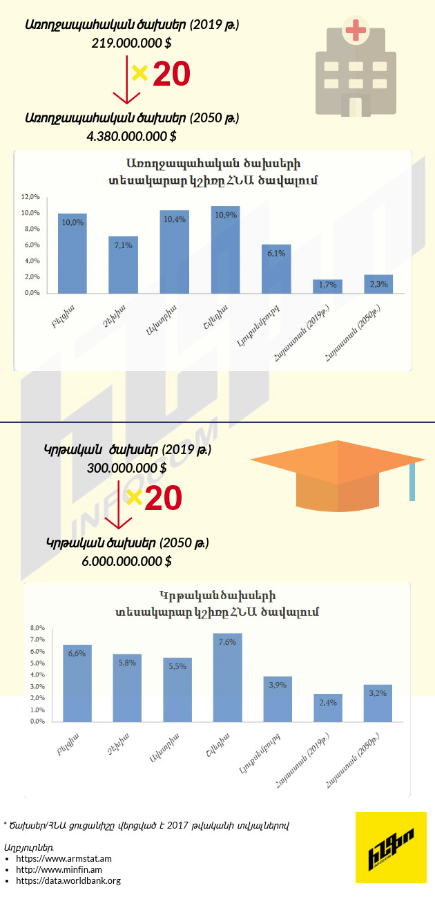 ՏՀԶԿ մի քանի երկրների ծախս/ՀՆԱ ցուցանիշների հետ վերոնշյալ համեմատականից պարզ է դառնում, որ անգամ 2050 թվականի համար կանխատեսված ցուցանիշով չենք հասնելու նշված երկրների կողմից ներկայումս առողջապահությանն ու կրթությանն ուղղվող ծախսերի մակարդակին: