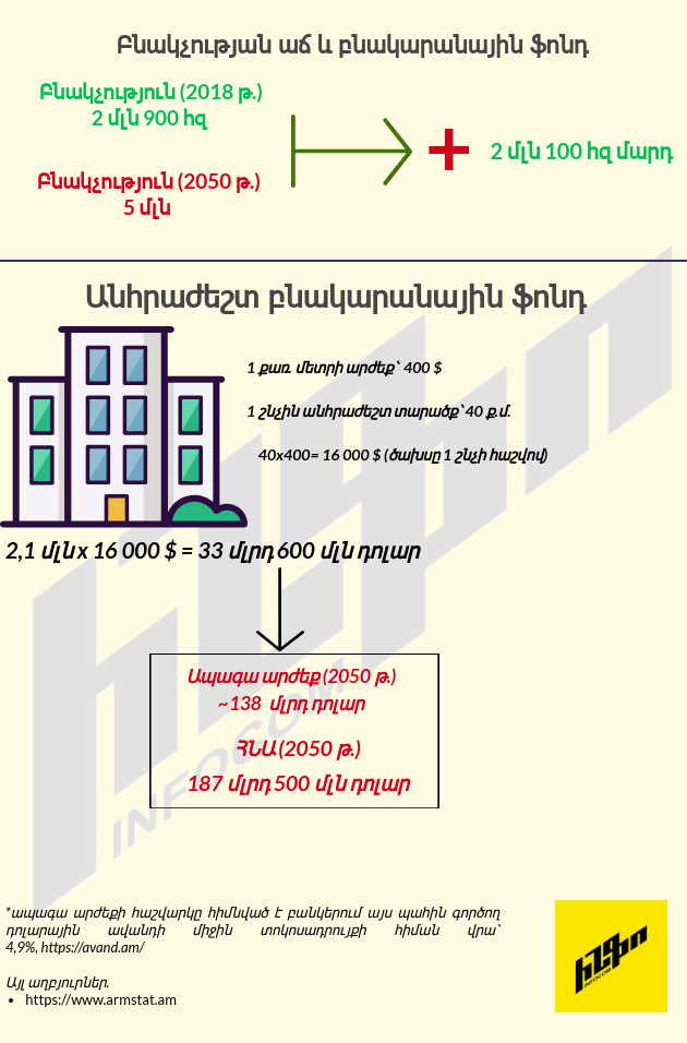 Ըստ Փաշինյանի ներկայացրած նպատակադրումների՝ 2050 թվականին բնակչության թիվը պետք է հասնի 5 միլիոնի: Ընդունենք՝ 2050 թվականին արդեն ունենք 5 միլիոն բնակչություն, այսինքն՝ 2,1 միլիոնով ավելին քան ներկայումս: Ավելացված բնակչությանը պետք է ապահովել բնակելի տարածքով, իսկ սովետական միության ժամանակ կառուցված շենքերը, ենթադրվում է, որ 30 տարի հետո այլևս բնակելի չեն լինի: