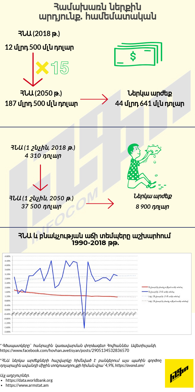 Եթե ընդունենք, որ մինչ 2050 թվականը, ըստ ռազմավարական նպատակադրումների, կունենանք 5 մլն բնակչություն, ապա մեկ շնչին բաժին ընկնող ՀՆԱ-ն կստացվի 37 500 դոլարի (ՀՆԱ/բնակչություն), որի ներկա արժեքը հավասար է 8 900 դոլարի: Ներկայումս 1 շնչին բաժին ընկնող ՀՆԱ-ն Հայաստանում 4 310 դոլար է՝ ըստ 2018 թվականի ՀՆԱ ցուցանիշի: Այսինքն, 30 տարի հետո մեկ շնչին բաժին ընկնող ՀՆԱ-ն կրկնապատկվելու է՝ հաշվի առնելով փողի ներկա արժեքը: Սակայն, այս մասով բավականին հետ ենք մնալու, օրինակ, Տնտեսական համագործակցության և զարգացման կազմակերպության (այսուհետ՝ ՏՀԶԿ) երկրների մեկ շնչին բաժին ընկնող ՀՆԱ-ի միջին ցուցանիշից, որը 2018 թվականի դրությամբ 45 600 դոլար է: