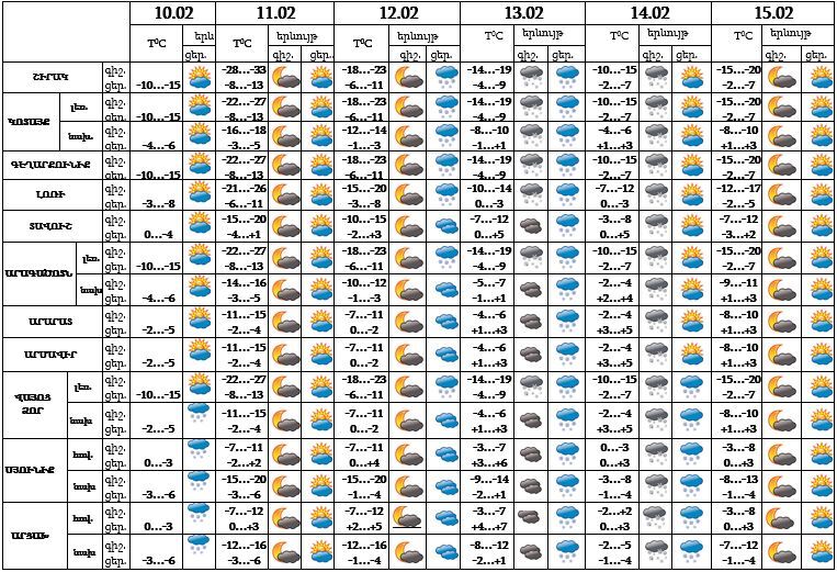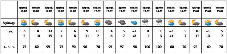 Փետրվարի 10-ի ցերեկը, 11-ին, 12-ի գիշերը, 14-ի ցերեկը, 15-ին սպասվում է առանց տեղումների եղանակ: Փետրվարի 12-ի երեկոյան ժամերին հնարավոր է, 13-ի երեկոյան ժամերին, 14-ի գիշերը սպասվում է ձյուն։