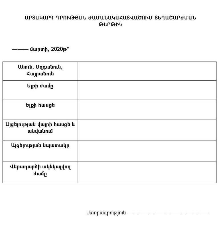 Սահմանված տեղեկությունները պարունակող գրության (նկարում) և անձը հաստատող փաստաթղթի առկայության դեպքում մարդկանց ազատ տեղաշարժվելու սահմանափակումների բացառություններն են․
