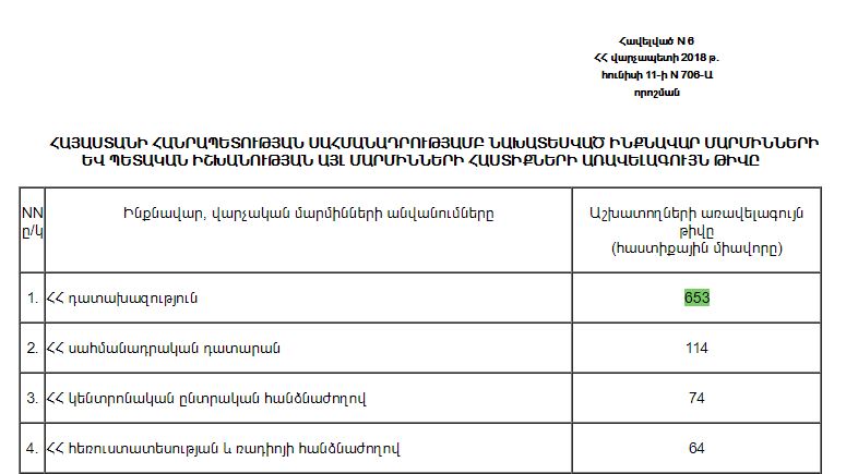Միաժամանակ տեղեկացնում ենք, որ «Պետական իշխանության մարմիններում հաստիքների առավելագույն թիվը սահմանելու մասին» N 706-Ա որոշման N 6 հավելվածի 1-ին կետում նշված է ՀՀ դատախազությունում աշխատողների առավելագույն թիվը (հաստիքների միավորը):
