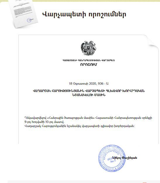 Վարչապետ Նիկոլ Փաշինյանը այսօր՝ օգոստոսի 18-ին, նոր որոշում է ստորագրել, որում նշվում է․ «Ղեկավարվելով «Հանրային ծառայության մասին» Հայաստանի Հանրապետության օրենքի 9-րդ հոդվածի 10-րդ մասով. Վաղարշակ Հարությունյանին նշանակել վարչապետի գլխավոր խորհրդական»։