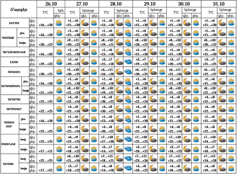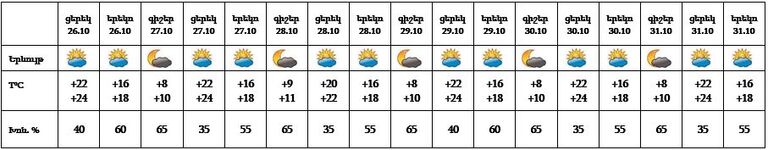 Հոկտեմբերի 26-ի ցերեկը, 27-31-ը սպասվում է առանց տեղումների եղանակ: