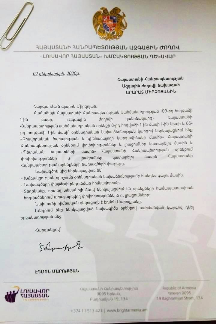 Տեղեկացնում եմ, որ ՀՀ ԱԺ «Լուսավոր Հայաստան» խմբակցությունը շրջանառության մեջ է դրել օրենքների նախագծերի փաթեթ՝ գերության մեջ հայտնված և անհայտ կորած մեր հայրենակիցների ընտանիքների դրամական ապահովության խնդիրը կարգավորելու նպատակով։