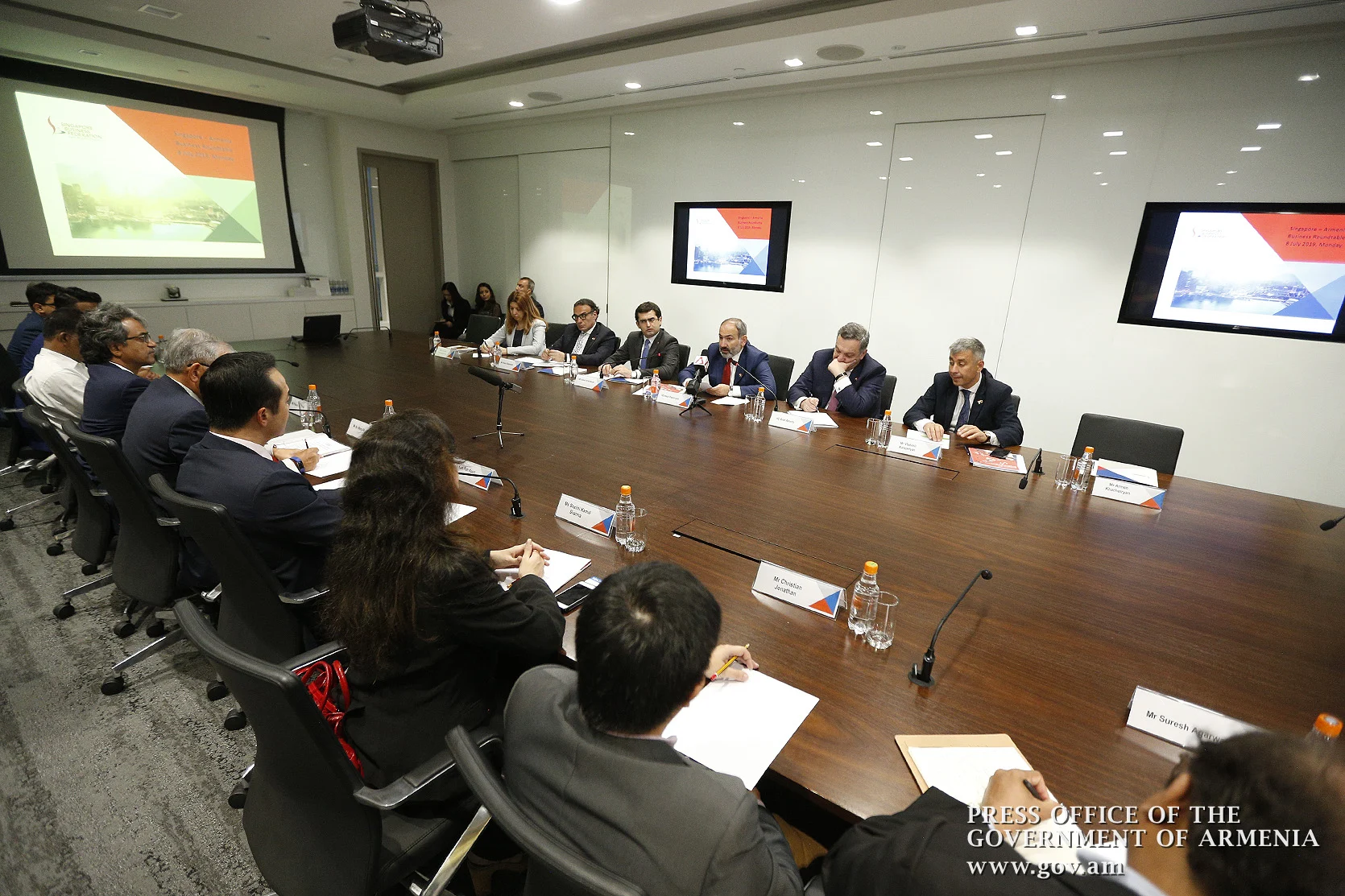 Վարչապետ Նիկոլ Փաշինյանը նշել է, որ ուրախ է հյուրընկալվել «Սինգապուրի բիզնես ֆեդերացիա» հիմնադրամում և քննարկել տնտեսական կապերի զարգացման հարցեր: «Մեր քաղաքական հարաբերությունները գտնվում են բարձր մակարդակի վրա: Հուսով եմ` այս այցից հետո դրանք էլ ավելի կամրապնդվեն, կակտիվանա նաև տնտեսական համագործակցությունը: Հայաստանը գտնվում է տնտեսական փոխակերպման գործընթացում, և մենք շարունակական աշխատում ենք տնտեսական աճի, գործարարությամբ զբաղվելու համար նպաստավոր պայմանների ստեղծման ուղղությամբ», – նշել է ՀՀ վարչապետը:Վարչապետն անդրադարձել է ՀՀ կառավարության կողմից նախաձեռնված բարեփոխումներին` խոսելով հարկային և մաքսային ոլորտի բարելավման ուղղությամբ իրականացվող քայլերի մասին, նաև դատական համակարգի բարեփոխումների մասին, որոնք ուղղված են օտարերկրյա ներդրումների պաշտպանության երաշխիքների ստեղծմանը: Նիկոլ Փաշինյանը նշել է, որ Հայաստանում նախորդ տարի տեղի ունեցած թավշյա հեղափոխությունը, քաղաքական արմատական փոփոխությունները տնտեսական ցնցումներ չեն առաջացրել, բանկային համակարգը շարունակել է կայուն աշխատել, չի արձանագրվել սեփականության վերաբաշխման որևէ դեպք, ինչը պայմանավորված էր այդ իրադարձությունների ոչ բռնի և խաղաղ բնույթով: Կառավարության ղեկավարը ներկայացրել է վերջին ամիսների մակրոտնտեսական ցուցանիշները` նշելով, որ դրանք շարունակական աճ են արձանագրում և անդրադարձել այն ոլորտներին, որտեղ համագործակցության ներուժ կա՝ տեղեկատվական տեխնոլոգիաներ, օդային հաղորդակցություն, զբոսաշրջություն, այդ թվում` էկո-, գաստրոտուրիզմ, սննդարդյունաբերություն, օդային հաղորդակցություն, ենթակառուցվածքներ և այլն: «Սինգապուրի զարգացման ուղին և կուտակած մեծ փորձը հետաքրքիր են Հայաստանի համար և կարող են օգտակար լինել մեր հետագա բարեփոխումների գործընթացում: Շահագրգռված ենք փորձի փոխանակմամբ և համատեղ ներդրումային ծրագրերի իրականացմամբ», – հավելել է Նիկոլ Փաշինյանը: