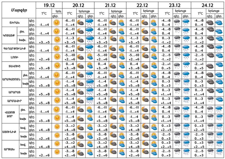 Դեկտեմբերի 19-ի ցերեկը, 21-22-ը, 24-ին սպասվում է առանց տեղումների եղանակ։ Դեկտեմբերի 20-ի ցերեկը և 23-ին սպասվում են տեղումներ, բարձրադիր գոտում՝ ձյան տեսքով։