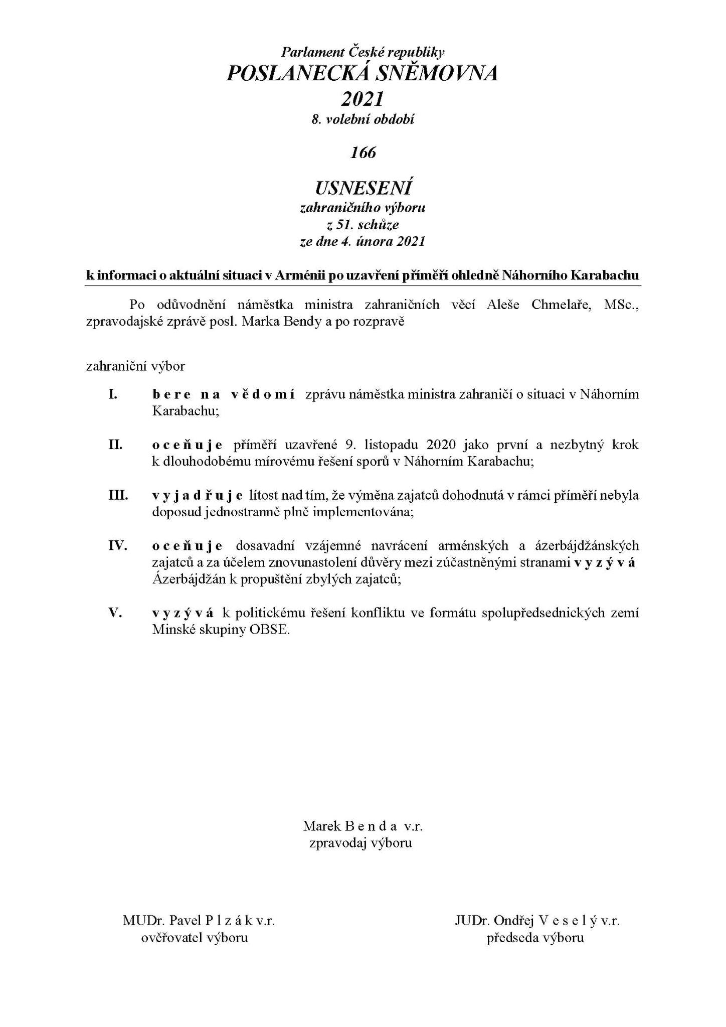 Փետրվարի 4-ին Չեխիայի խորհրդարանի Պատգամավորների պալատի Արտաքին հարաբերությունների կոմիտեն ընդունեց Լեռնային Ղարաբաղի հակամարտությանն առնչվող բանաձև: Այս մասին տեղեկացնում է Պրահայում Հայաստանի դեսպանությունը: