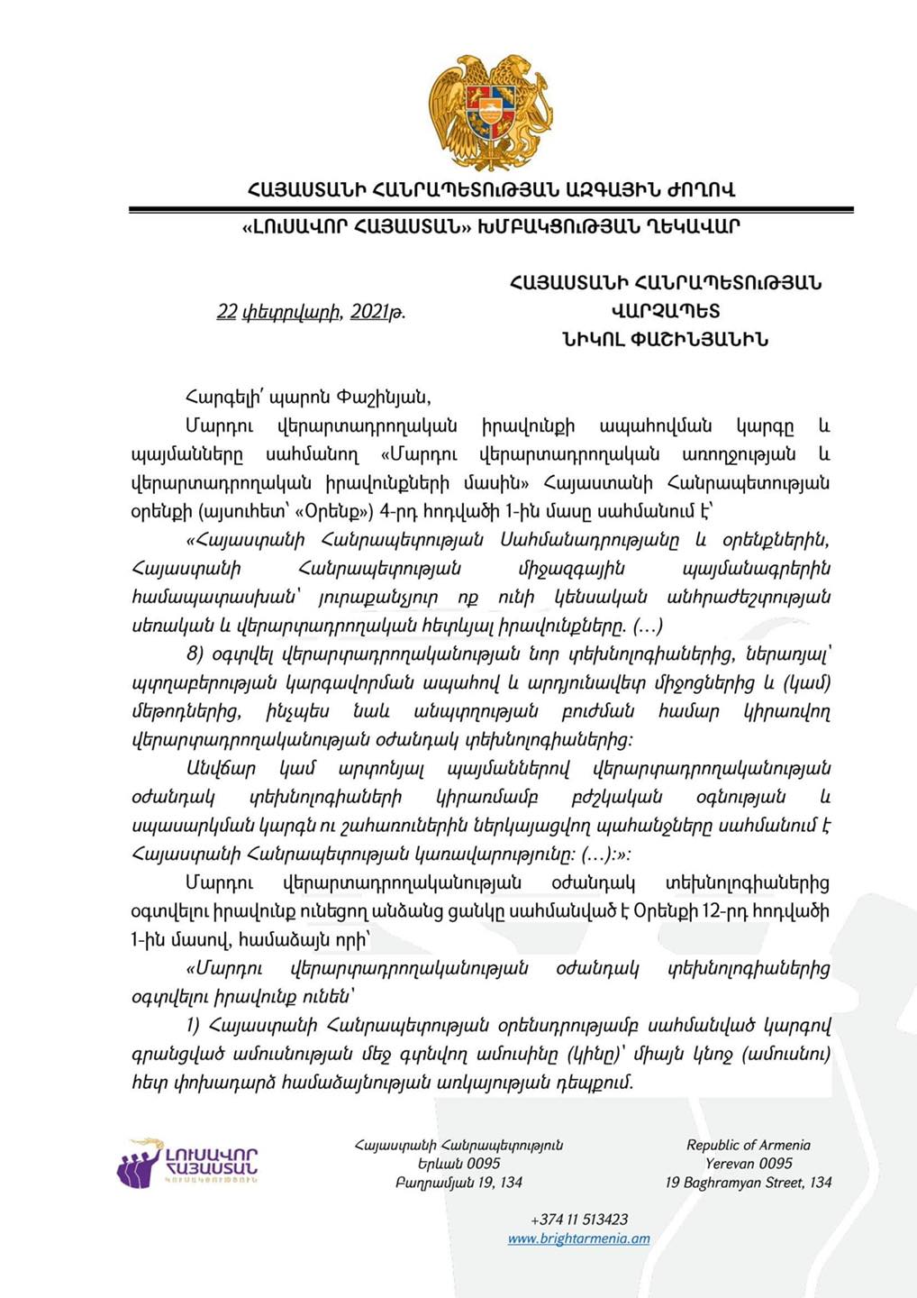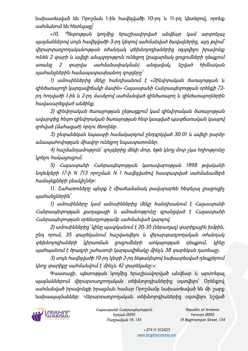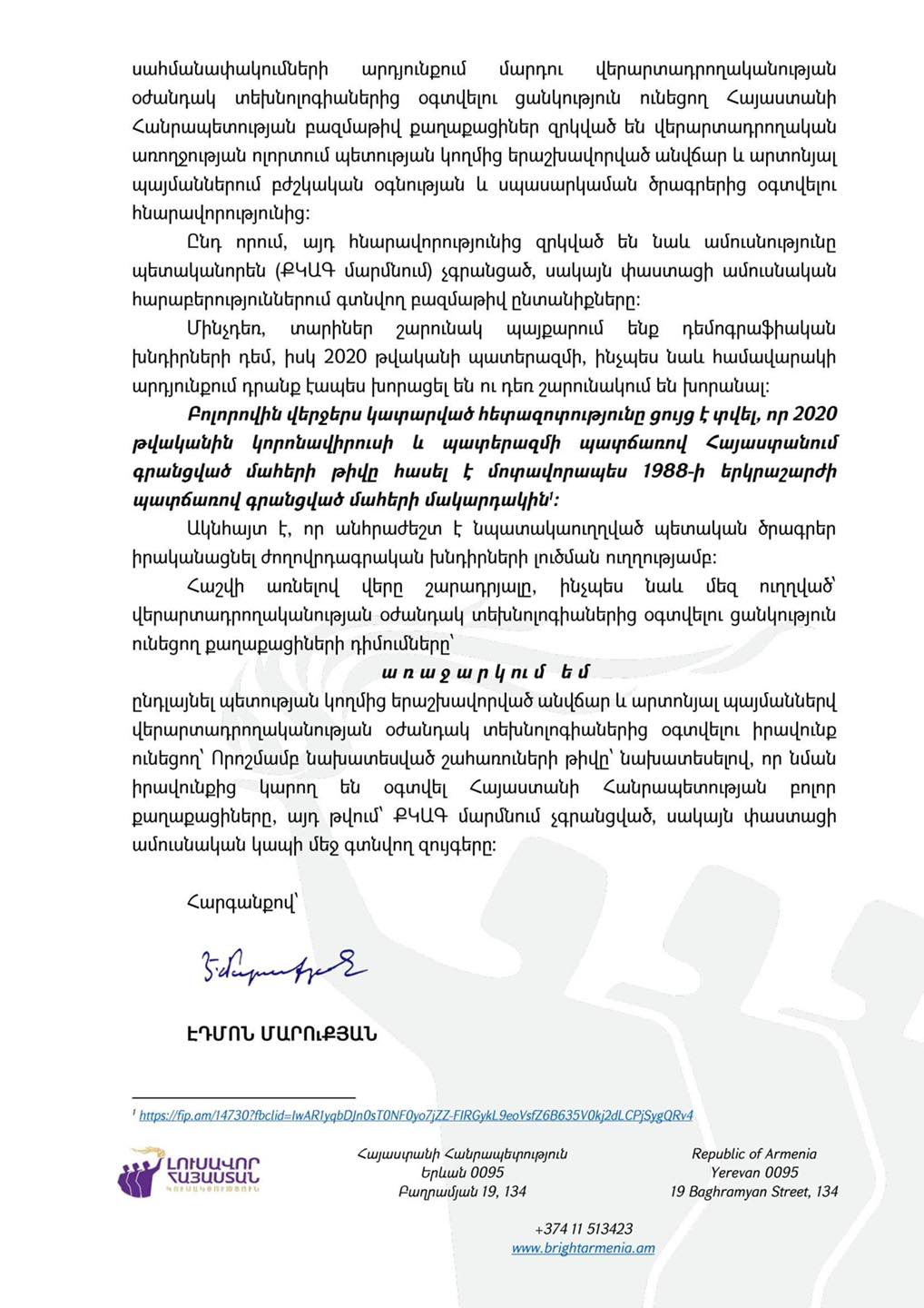 Հաշվի առնելով պատերազմի և համավարակի հետևանքով խորացած դեմագրաֆիական խնդիրները՝ առաջարկել եմ ընդլայնել անվճար և արտոնյալ պայմաններվ վերարտադրողականության օժանդակ տեխնոլոգիաներից օգտվելու իրավունք ունեցող անձանց թիվը՝ նախատեսելով, որ նման իրավունքից կարող են օգտվել ՀՀ բոլոր քաղաքացիները, այդ թվում՝ ՔԿԱԳ մարմնում չգրանցված, սակայն փաստացի ամուսնական կապի մեջ գտնվող զույգերը»,- գրել է նա։