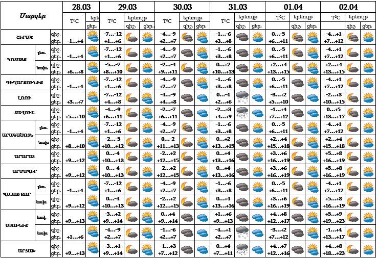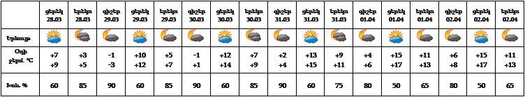 Մարտի 28-30-ը, 31-ի ցերեկը, ապրիլի 1-2-ը սպասվում է առանց տեղումների եղանակ: Մարտի 31-ի գիշերը Լոռիում, Տավուշում, Սյունիքում և Արցախում, ժամանակ առ ժամանակ սպասվում են թույլ տեղումներ: