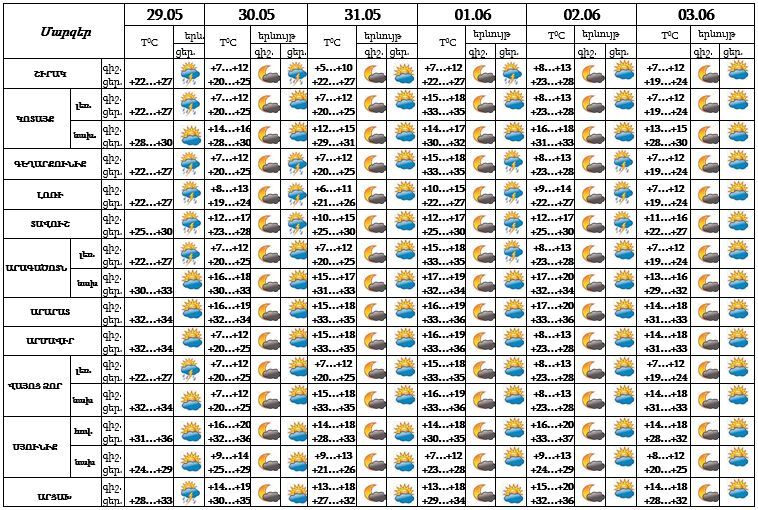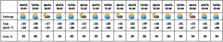 Հանրապետության տարածքում` մայիսի 29-ի ցերեկը, 30-ին, հունիսի 1-2-ը կեսօրից հետո առանձին շրջաններում սպասվում է անձրև և ամպրոպ, առանձին հատվածներում հնարավոր է կարկուտ։ Մայիսի 31-ին, հունիսի 3-ին սպասվում է առանց տեղումների եղանակ։ Այս մասին հայտնում են ԱԻՆ-ից։