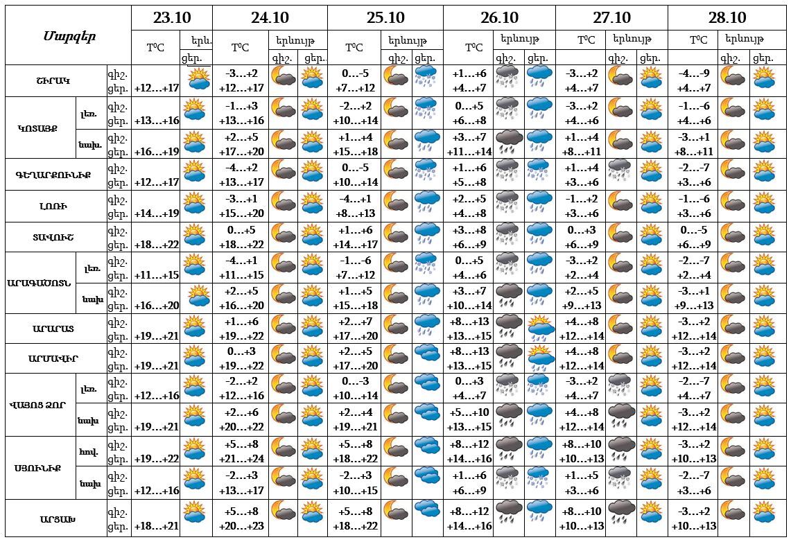 Հանրապետության տարածքում հոկտեմբերի 23-ի ցերեկը, 24-ին, 25-ի գիշերը, 27-ի ցերեկը, 28-ին սպասվում է առանց տեղումների եղանակ:
